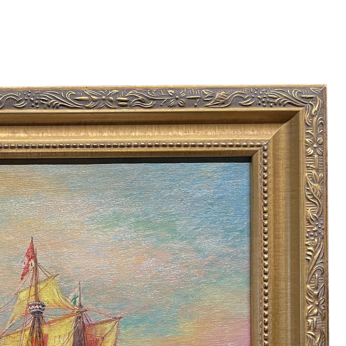 This painting portrays the ship with it's two accompanying vessels launching row boats off the coast of Virginia. The painting is in excellent condition and is housed in a contemporary carved gilt frame, this fine antique painting is ready to hang on your wall.