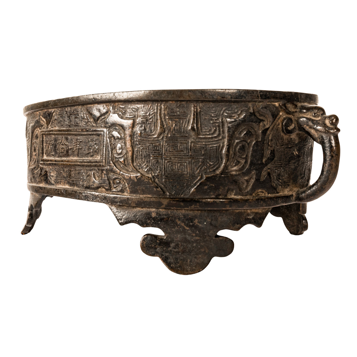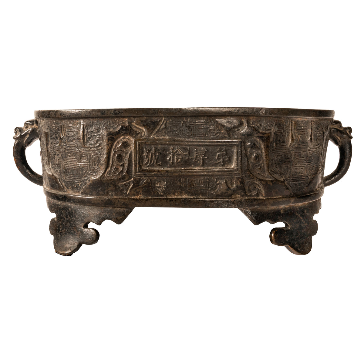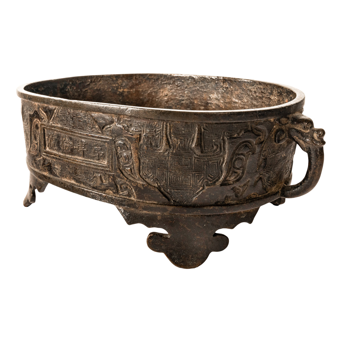A good antique Chinese Zhou dynasty style archaistic bronze censer, incense burner. This cast bronze censer is in the archaic Zhou dynasty style, but believed to be more likely from the Ming dynasty. The shallow oval shaped censer with zoomorphic handles modelled with the heads of mythical beasts, the body of the censer is decorated with typical archaistic designs. The censer having a panel of sixteen Chinese characters to the front and a panel to the verso with four characters, The censer stands of four lobed feet and to the underside is a four character mark. It is possible that the censer is much earlier, however this bronze came from a New York collection dating to the late 19th century and was catalogued as Ming dynasty in the archaistic Zhou dynasty style.
