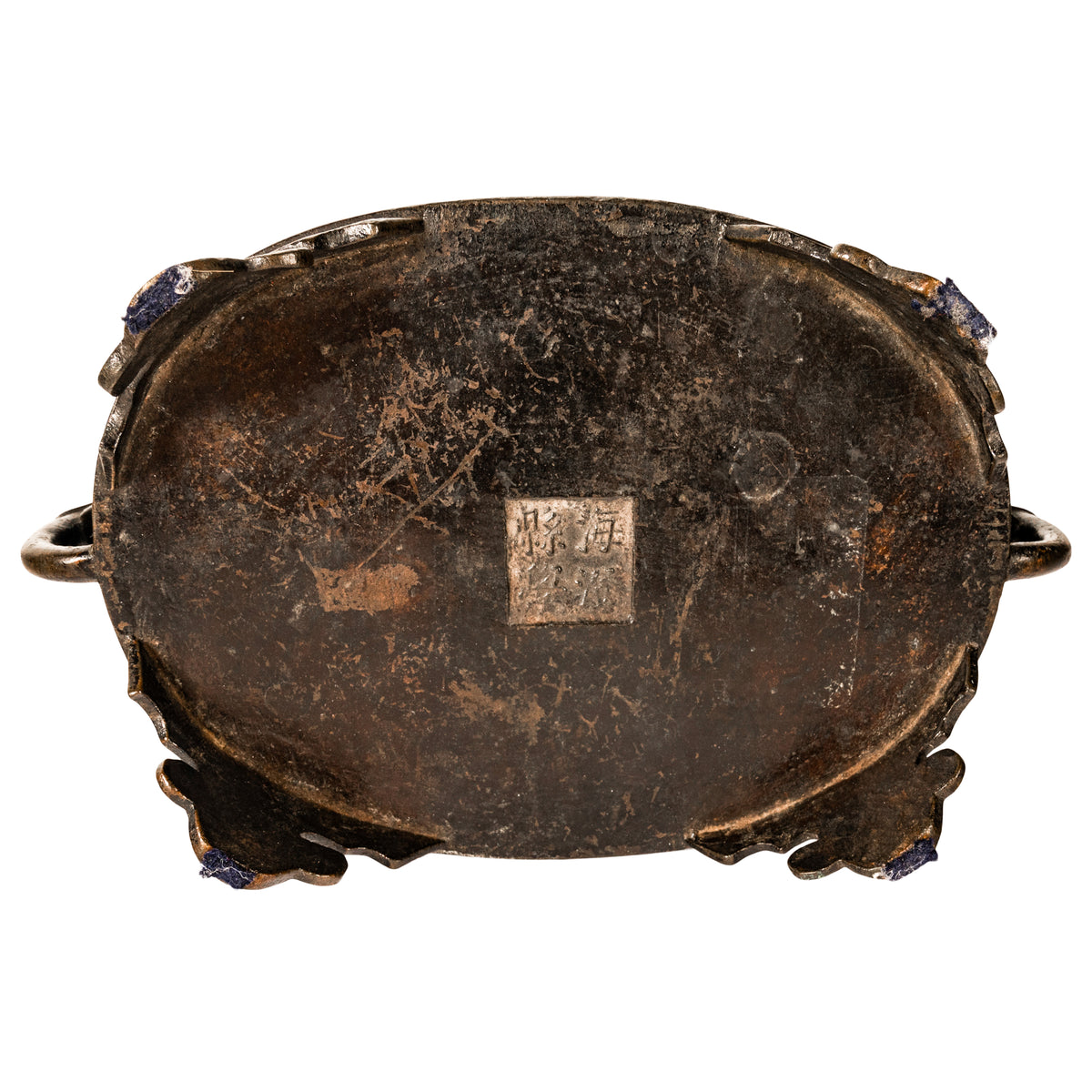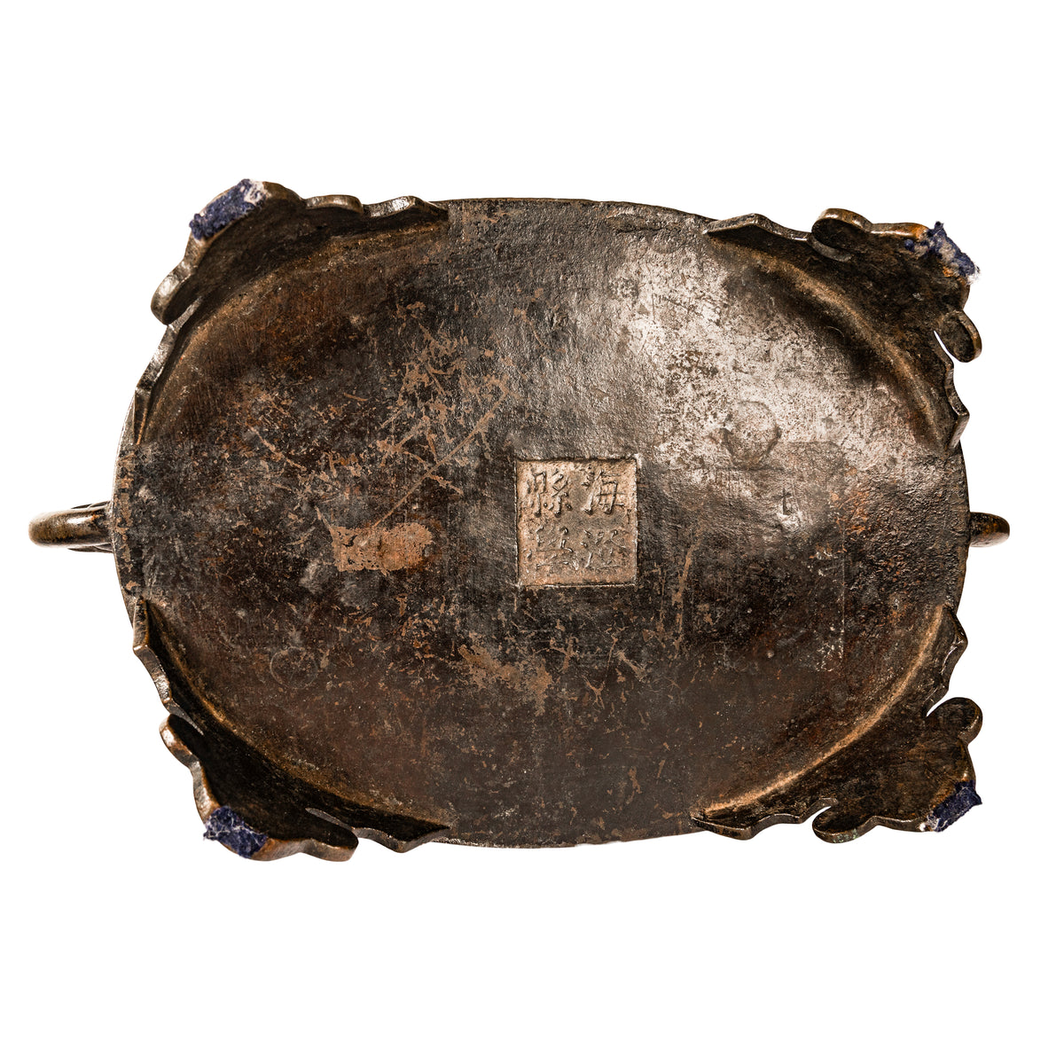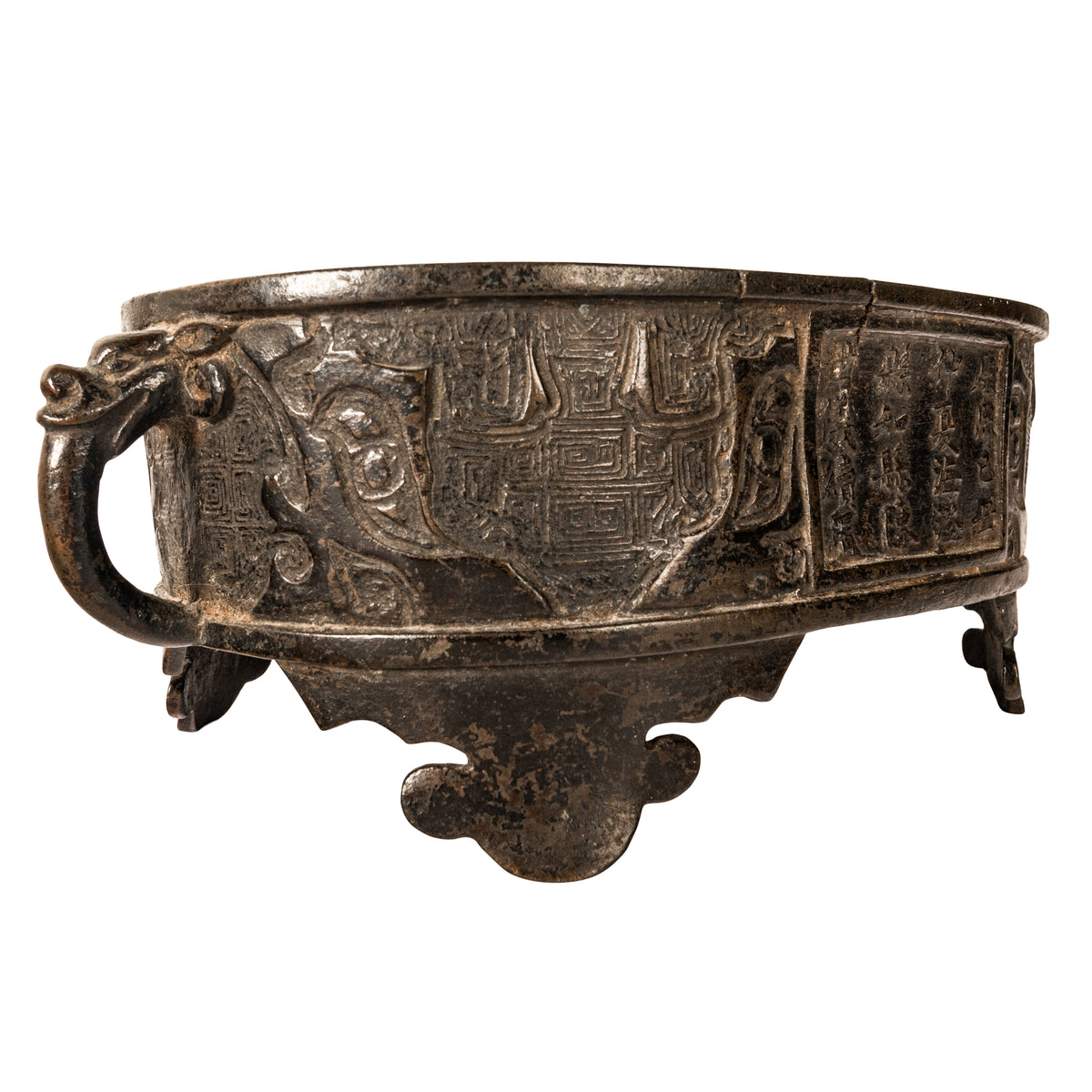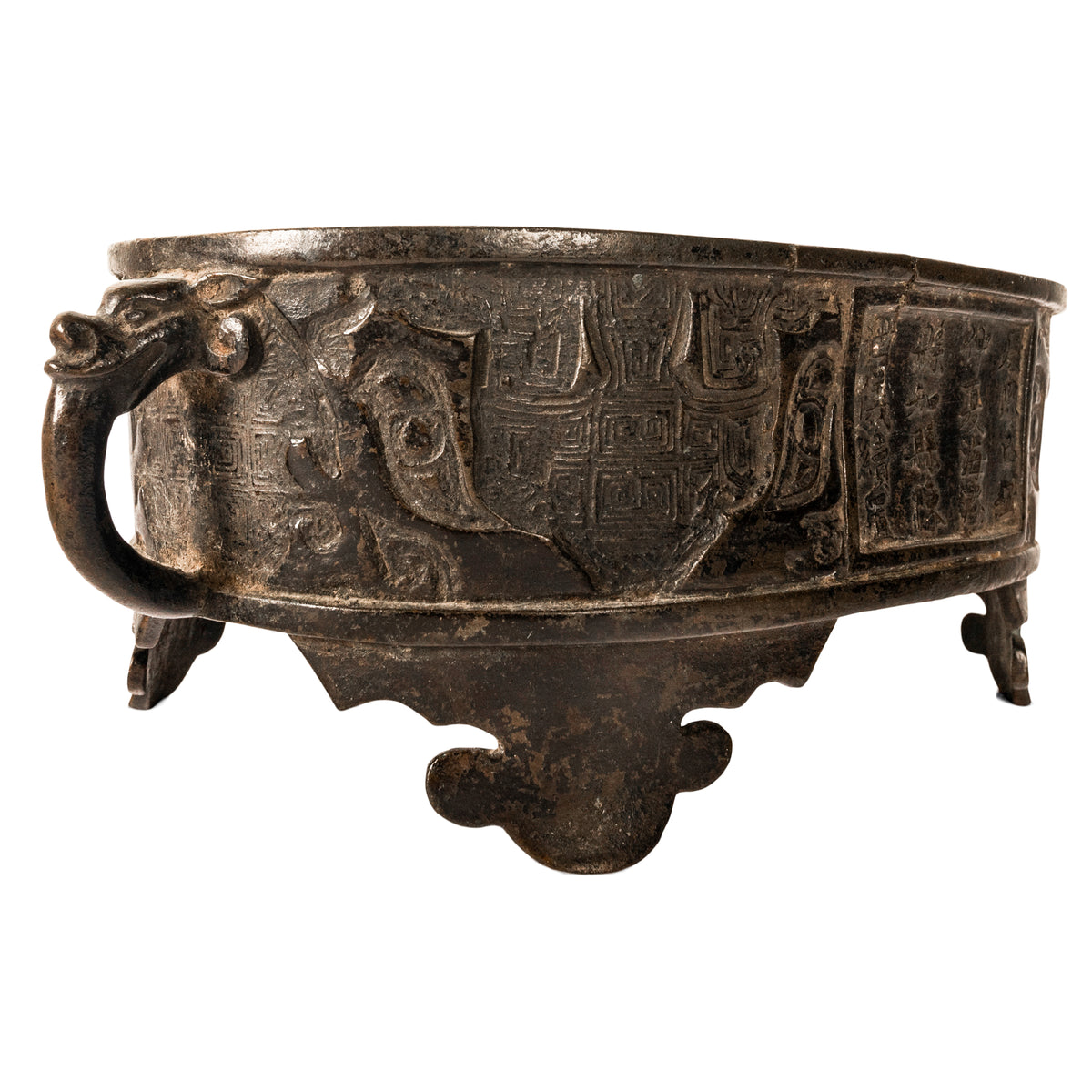 A good antique Chinese Zhou dynasty style archaistic bronze censer, incense burner. This cast bronze censer is in the archaic Zhou dynasty style, but believed to be more likely from the Ming dynasty. The shallow oval shaped censer with zoomorphic handles modelled with the heads of mythical beasts, the body of the censer is decorated with typical archaistic designs. The censer having a panel of sixteen Chinese characters to the front and a panel to the verso with four characters, The censer stands of four lobed feet and to the underside is a four character mark. It is possible that the censer is much earlier, however this bronze came from a New York collection dating to the late 19th century and was catalogued as Ming dynasty in the archaistic Zhou dynasty style.