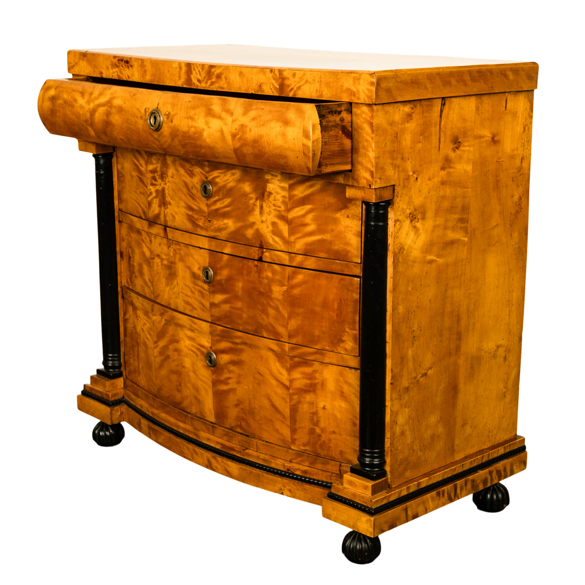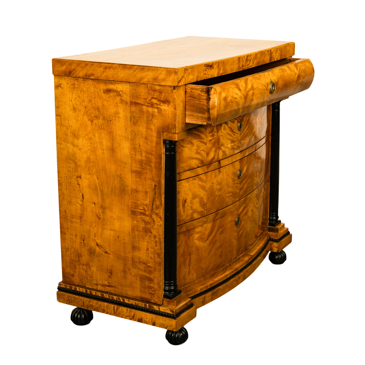 This very elegant golden birch chest having four drawers, the top drawer having a raised profile, below are three graduated bow fronted drawers, flanked by a pair of ebony columns. The base of the chest having an ebony gadrooned molding and raised on ribbed ebony bun feet. The chest is in excellent condition, the drawers run smooth, no condition issues noted, the original key is present.