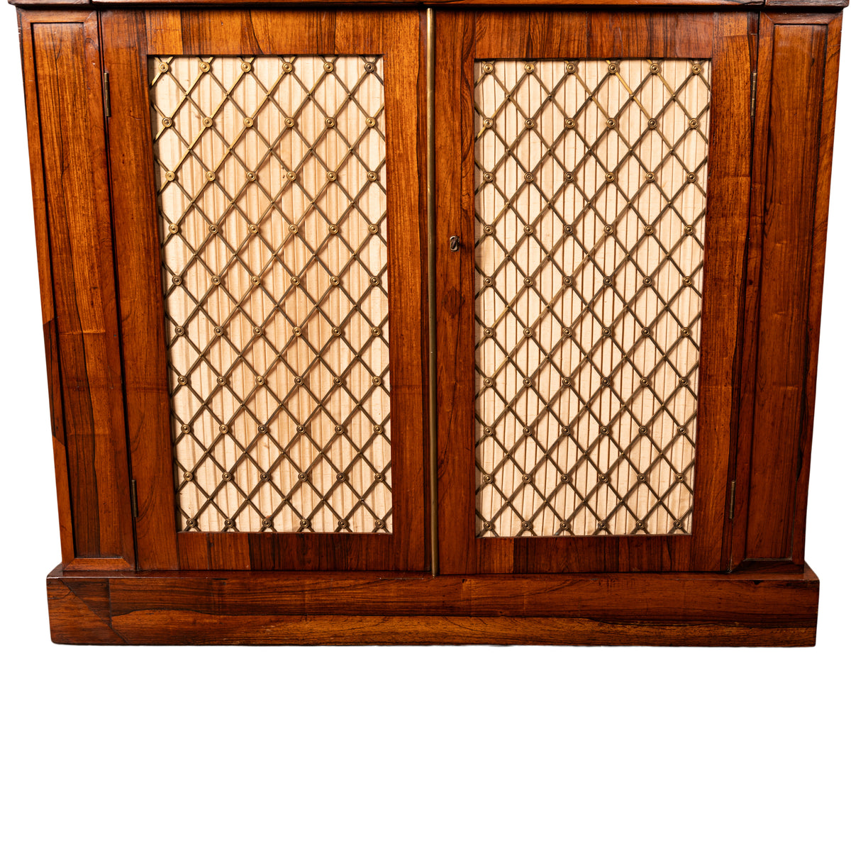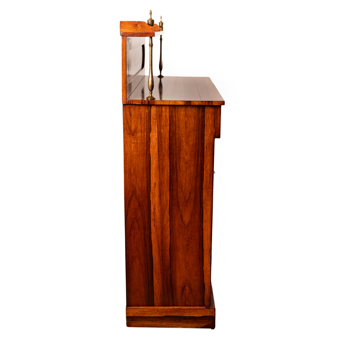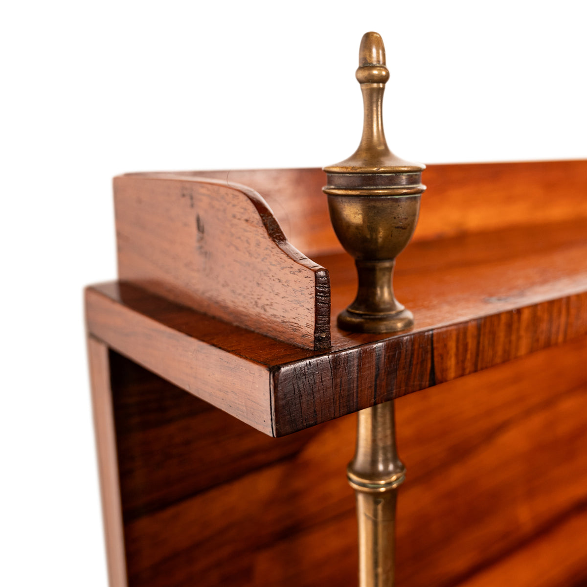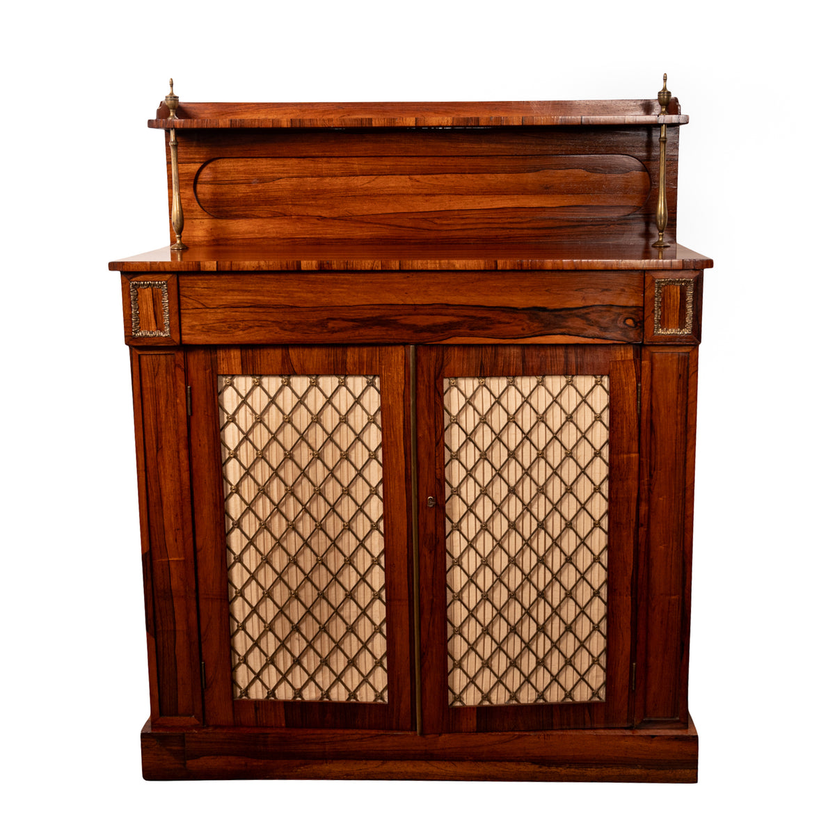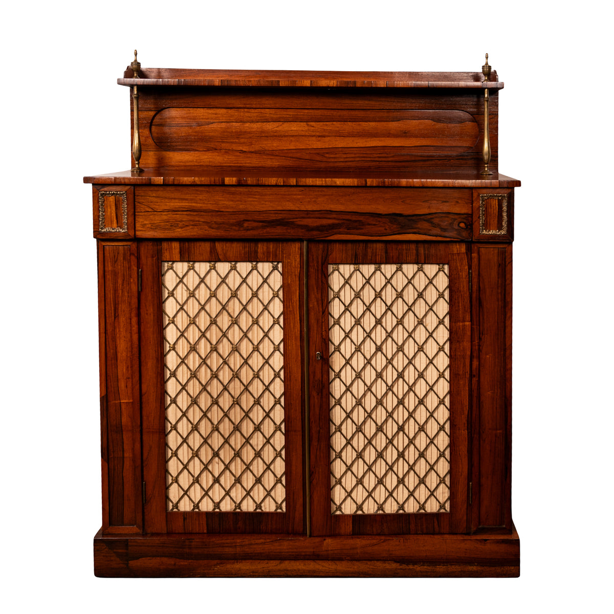 This very attractive and good quality rosewood chiffonier having a galleried back with a single shelf supported by a pair of brass baluster shaped columns, surmounted with a pair of neoclassical urn shaped finials. Below is a single drawer flanked with a pair of recessed 'tablets' lined with gilt brass acanthus leaf trim. The base having twin doors with gilt brass grills which enclose a single shelf, the chiffonier is raised on a plinth shaped base.