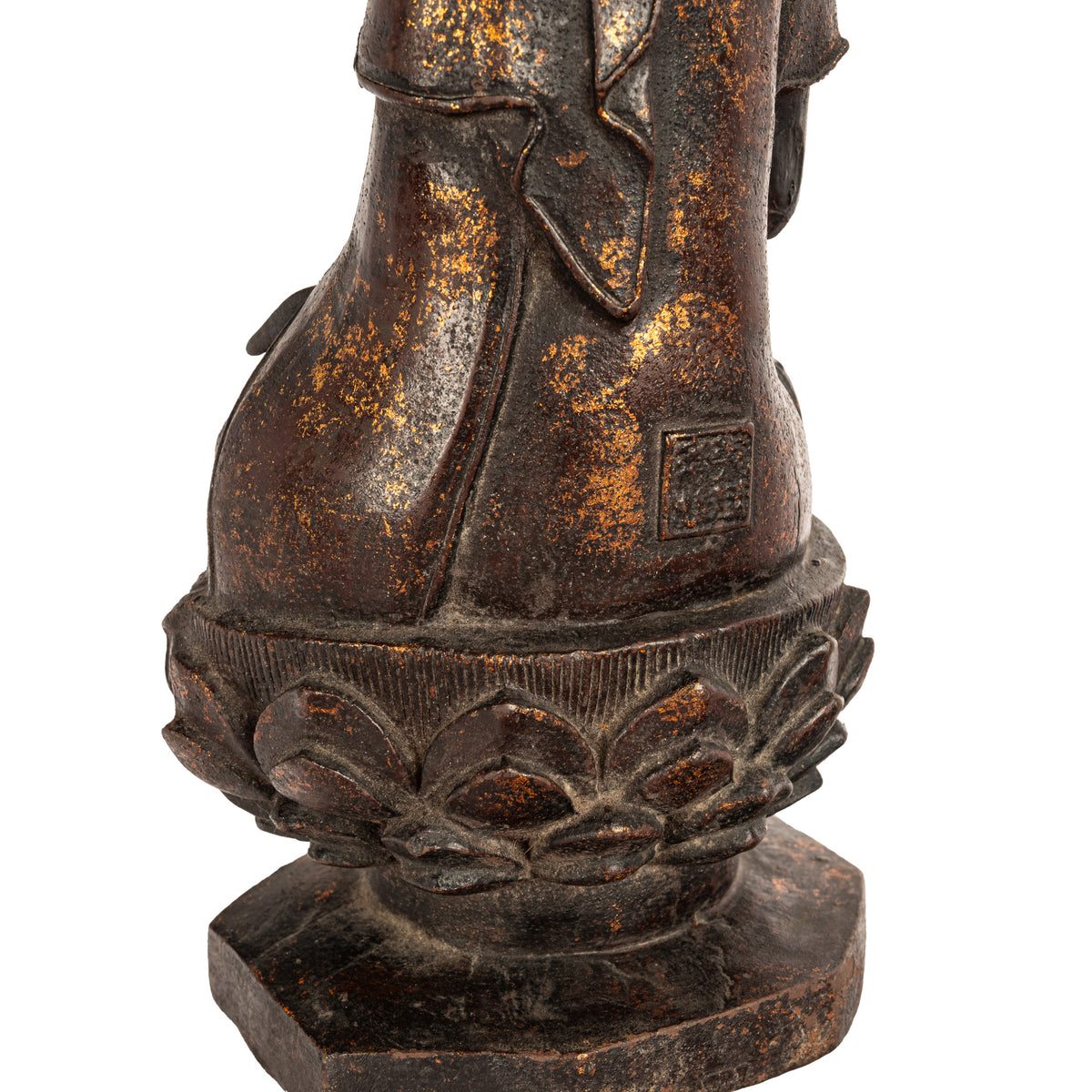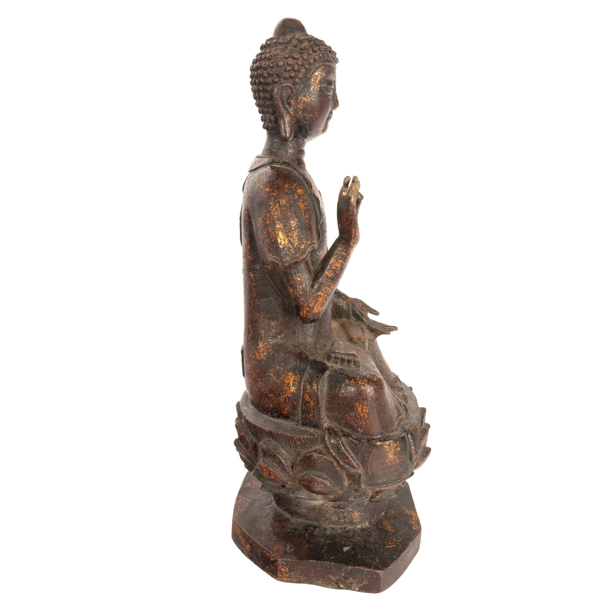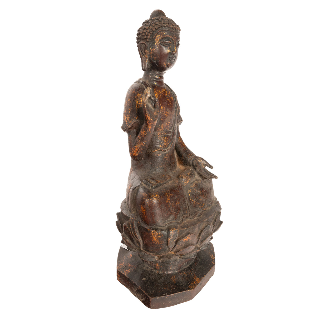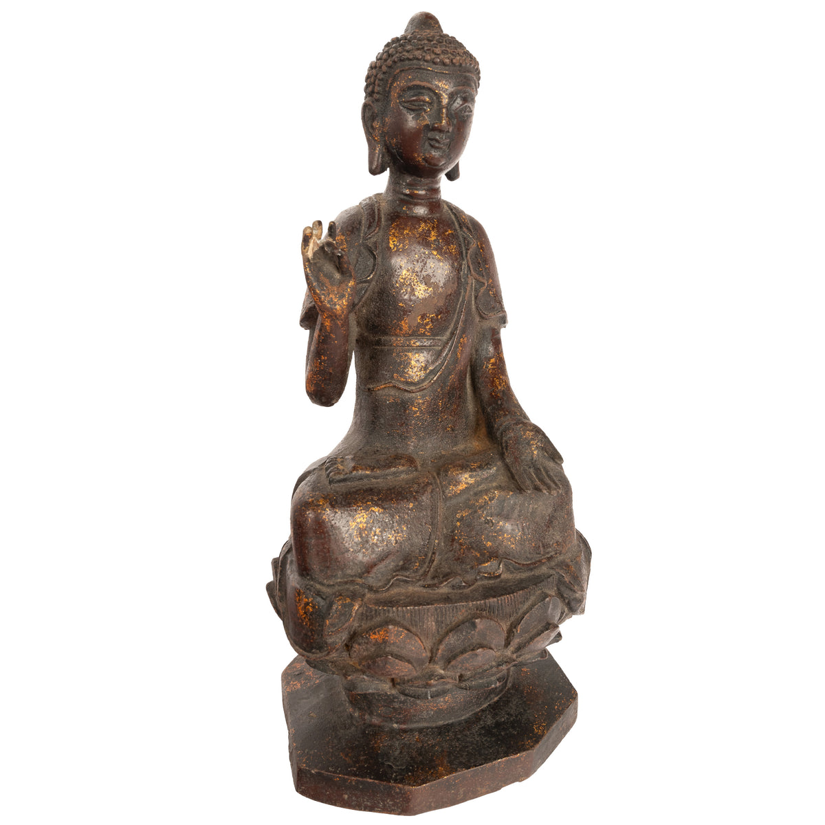 The bronze depicts the Buddha in a protection pose, the statue is shown seated on a lotus flower throne, with remnants of gilded decoration & a four character mark to the rear base of the statue, the bronze is in very good antique condition, the bronze weighs 6lbs.