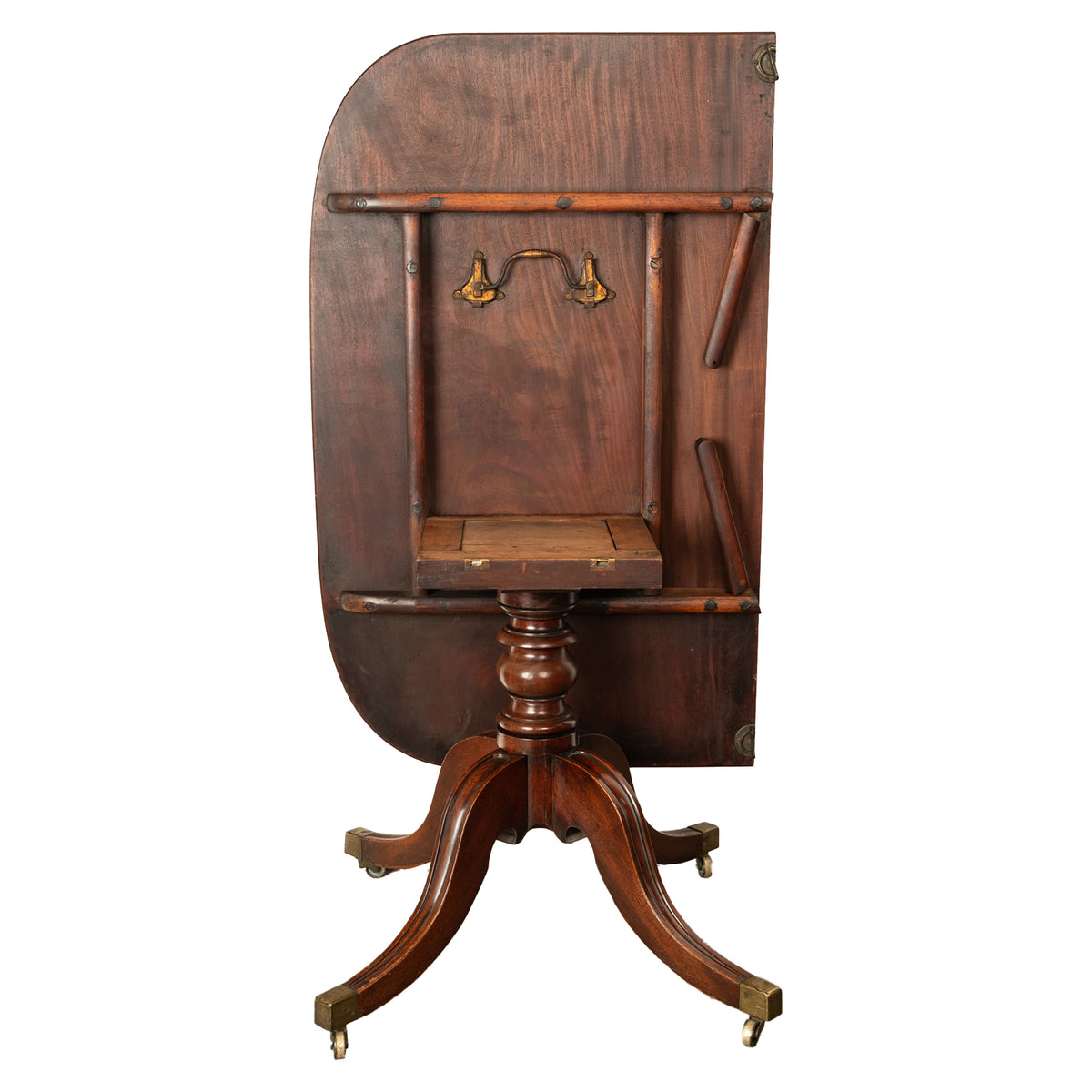 With the leaf removed each pedestal table has tilt-top mechanism and can be joined to form a smaller table, all the original brass handles & brass mechanisms are present and work with ease. The leaf is well supported with the original brass locking supports, when the leaf is locked is the table is very robust, level and a joy to sit at!