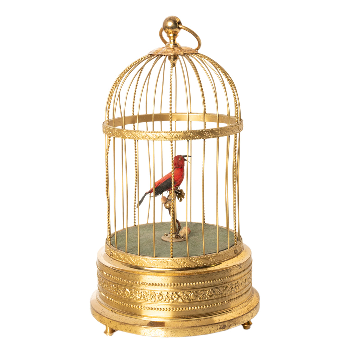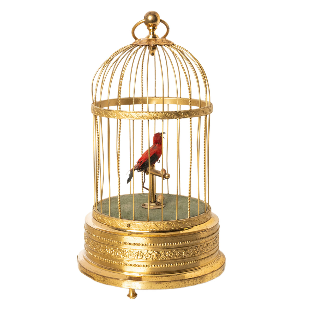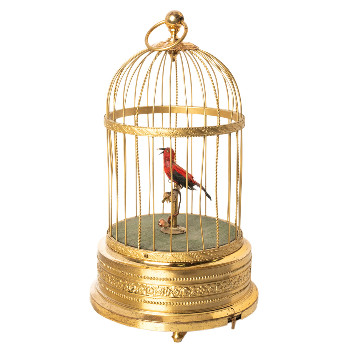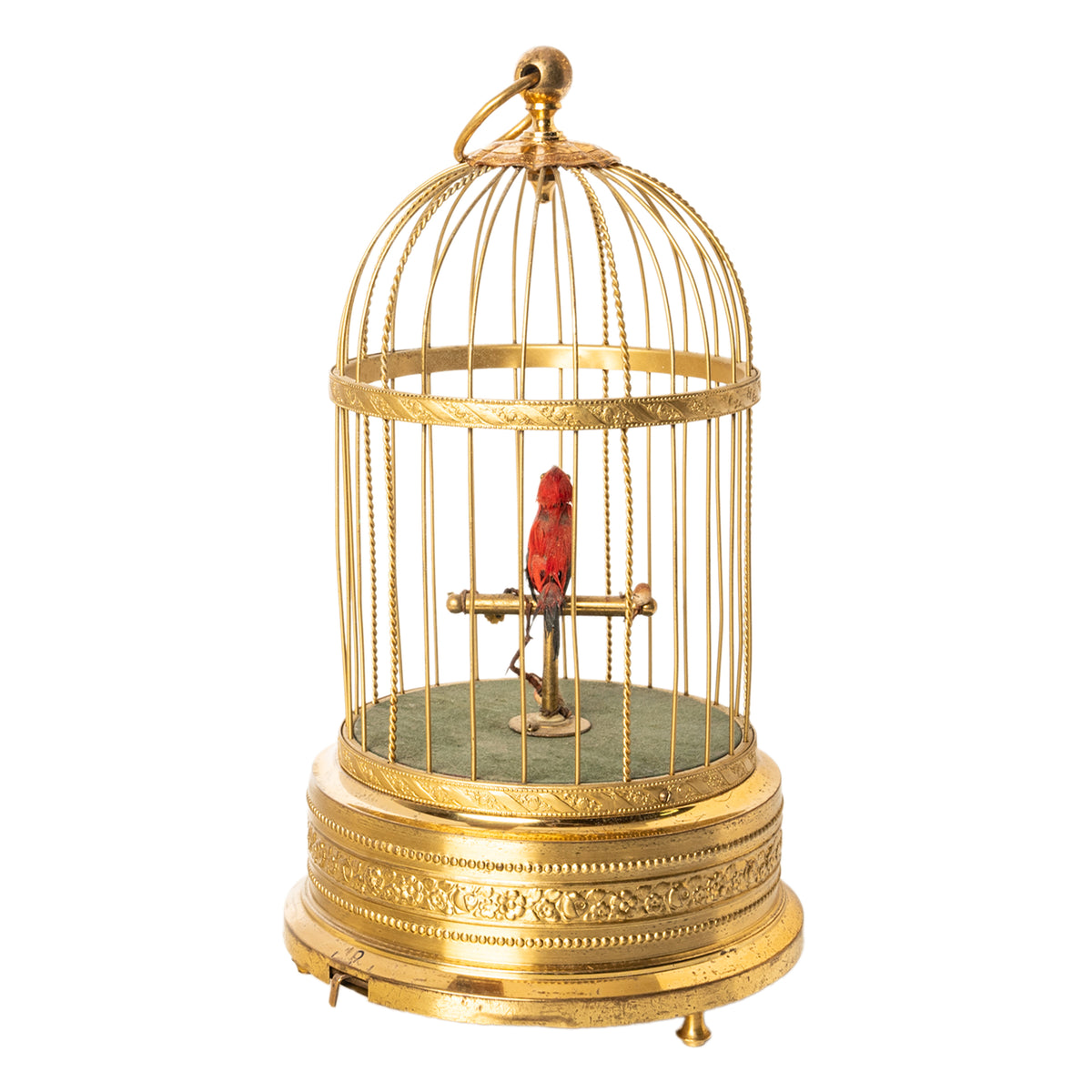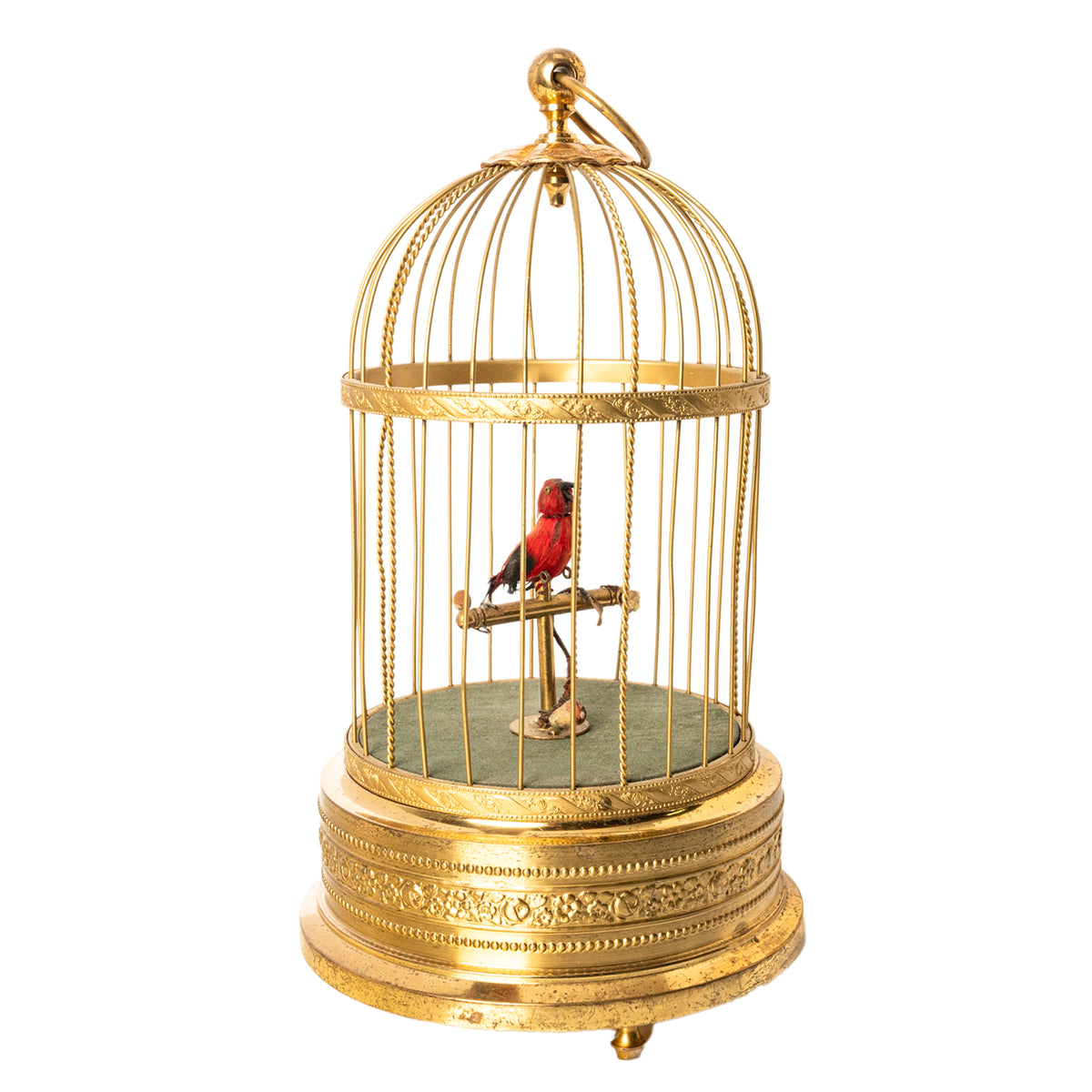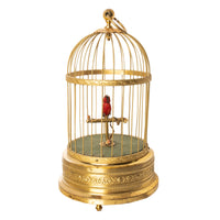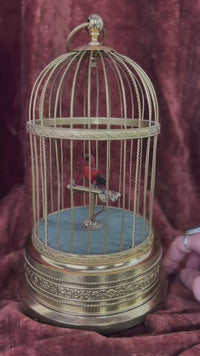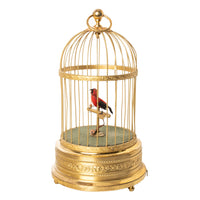 A feathered single bird sings its various bird song calls while moving its tail and opening it's beak in song, whilst swiveling its head standing on a perch inside a brass cage. The dome shaped cage with a large ring to allow it to be suspended, with twin bands of brass with embossed floral decoration and 'barley twist' bars. The base also decorated with floral decoration, the cage is raised on three turned brass feet allowing it to also be placed on a table top..