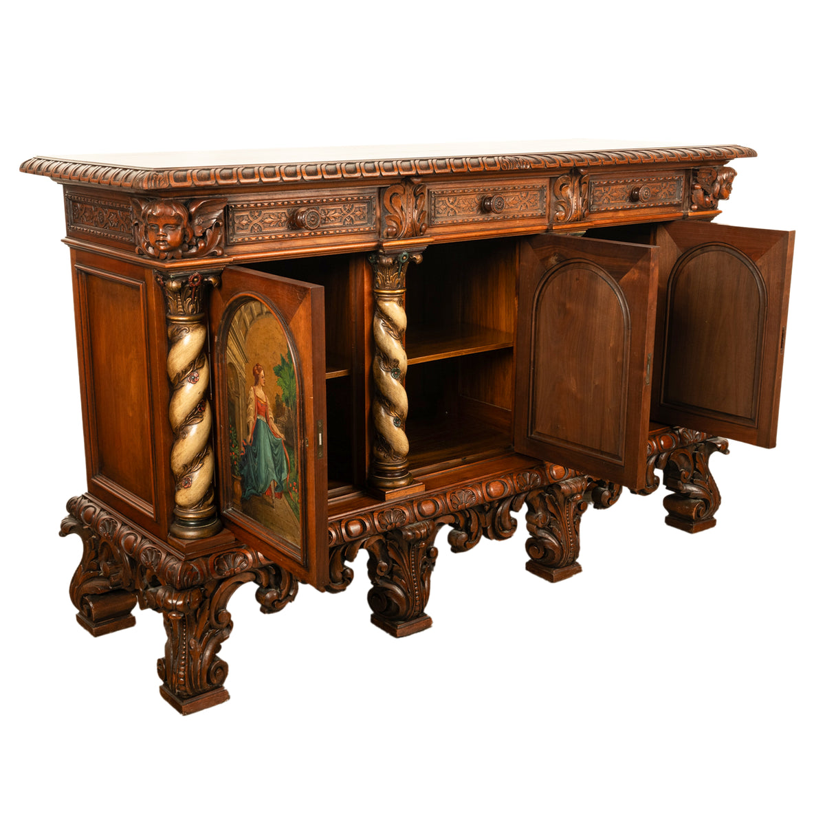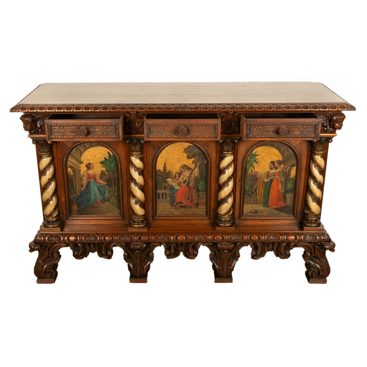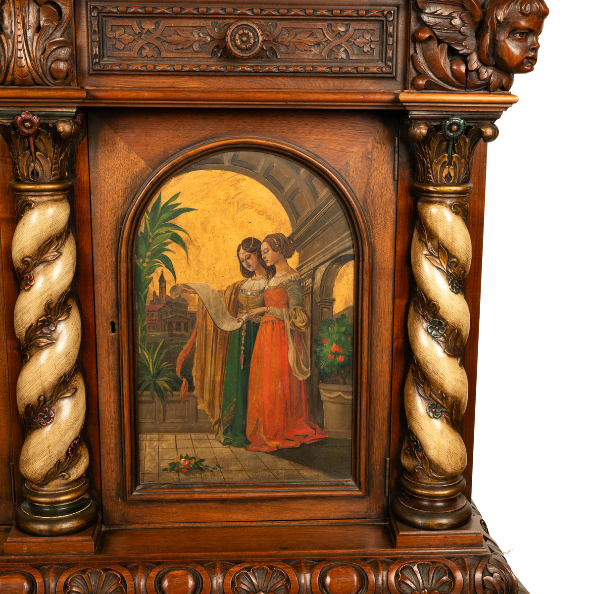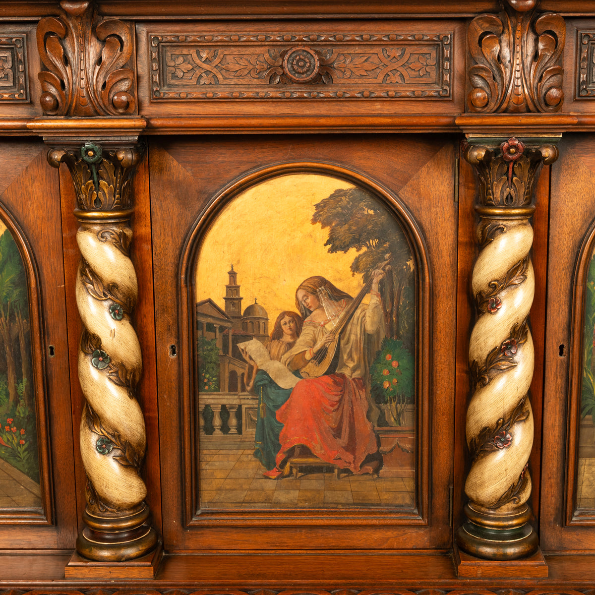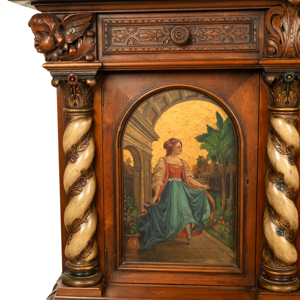 The cabinet has four 'barley twist' poly chromed & bronzed columns with ornately carved capitals, the columns entwined with carved trailing ivory. There are three arched doors (each enclosing a shelf) that are finely hand painted with beautiful Renaissance maidens, one dancing maiden, two playing music & two reading poetry. The cabinet is raised on an ornately carved base with tall bracket feet carved with acanthus leaves, the original key is present, condition is excellent.
