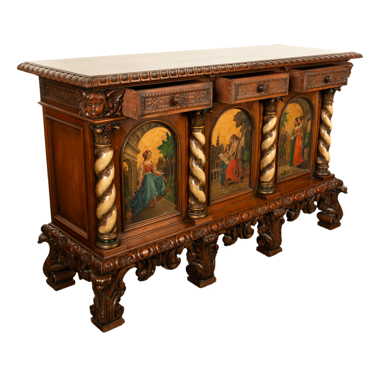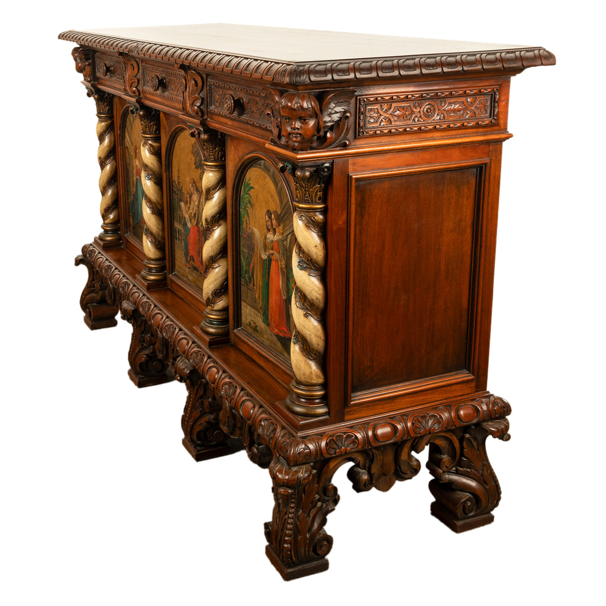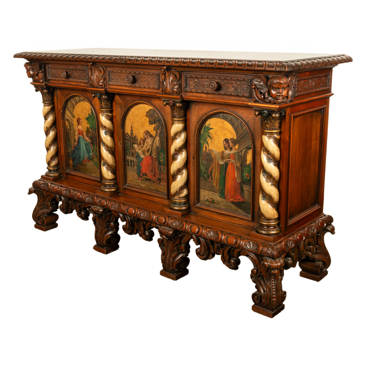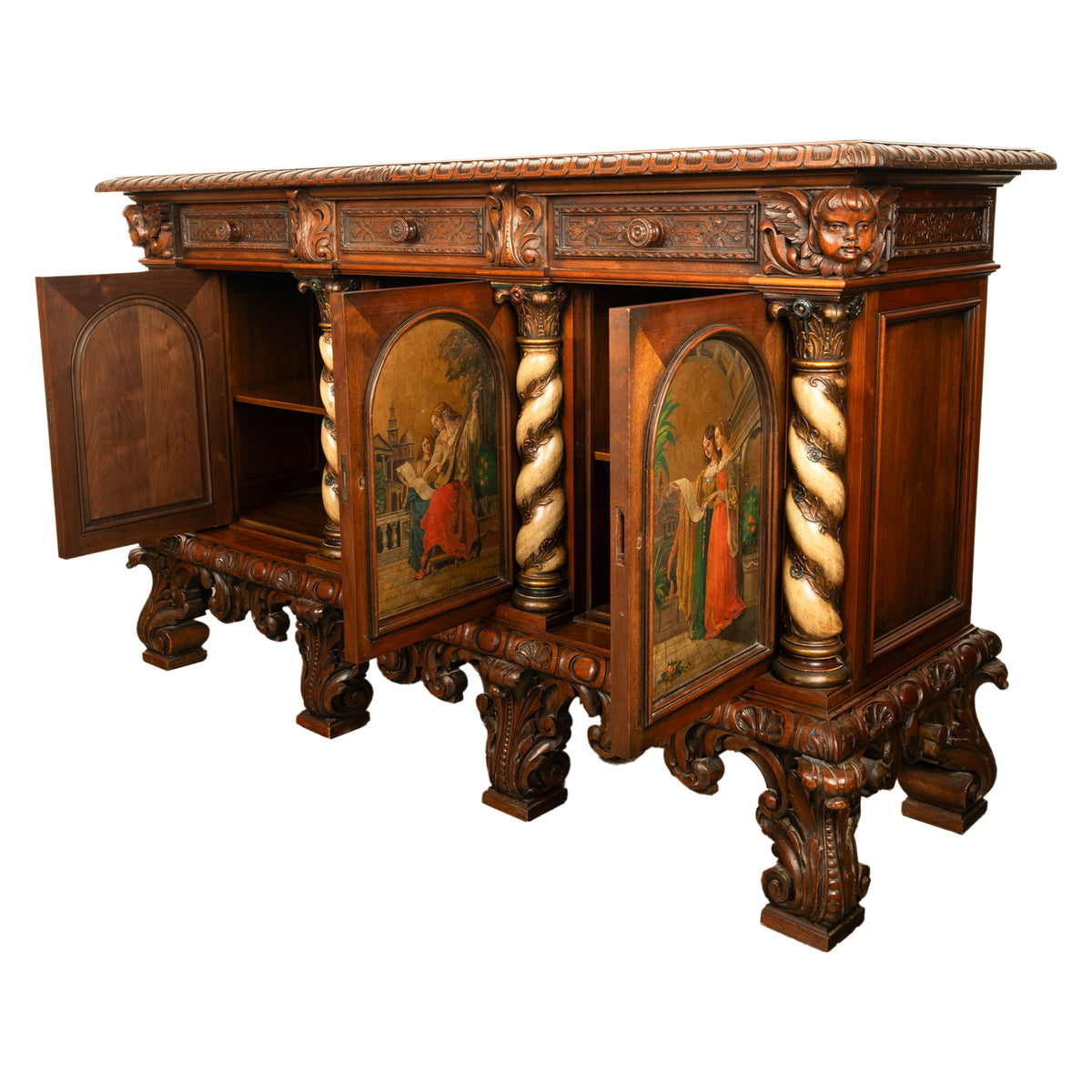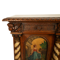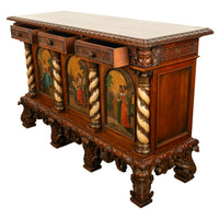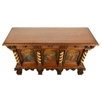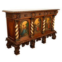 A fine antique Italian carved & hand painted poly chrome walnut cassone cabinet, buffet, circa 1890.