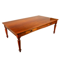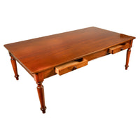 The table is made from the finest solid flame mahogany, the substantial top over two long drawers to the front, each fitted with a bun shaped handle. The table is raised upon four ring turned legs, the gently tapered baluster shaped legs terminating to corresponding tapered feet.