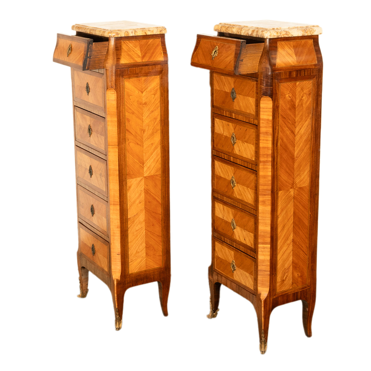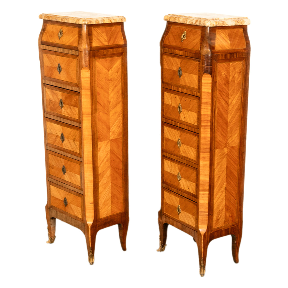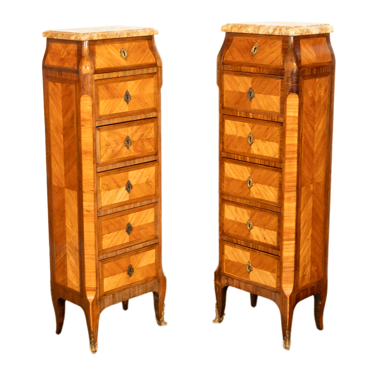 Each chest having a varigated 'caramel' colored marble top with a tapered top and six drawers below. Made from feather banded and parquetery kingwood & tulipwood panels, each drawer and the sides of the chests having quartered panels of these two exotic woods.