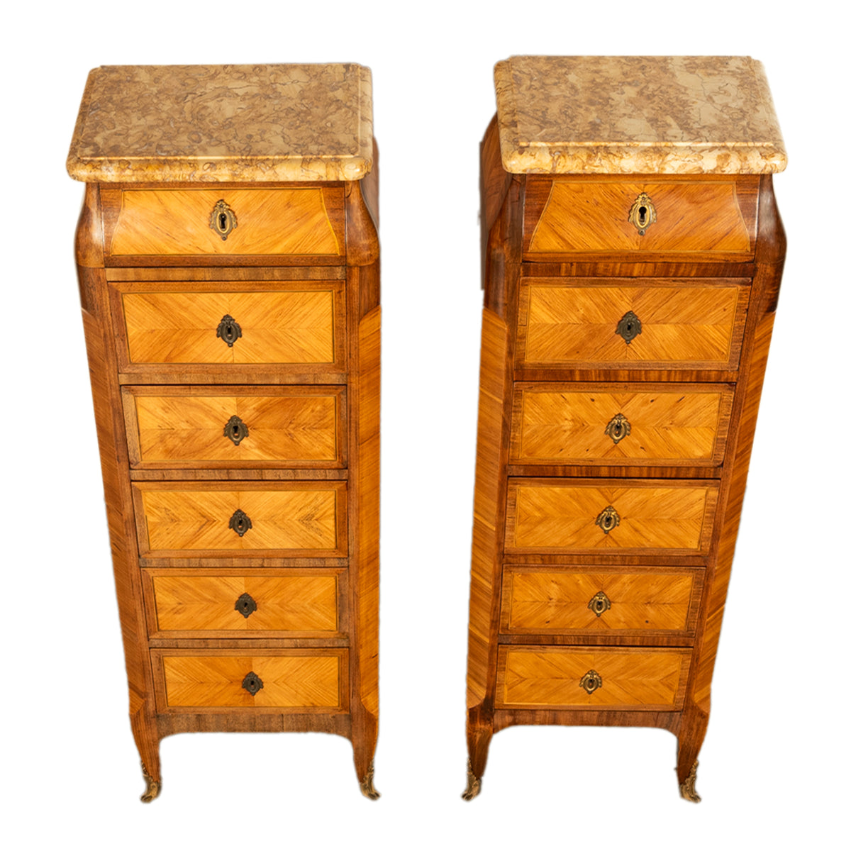 Each drawer has a gilt bronze laurel wreath lockplate/escutcheon, each chest has a key, the chests are raised on cabriole feet, mounted with gilt bronze sabots.