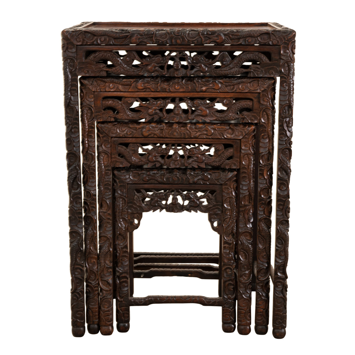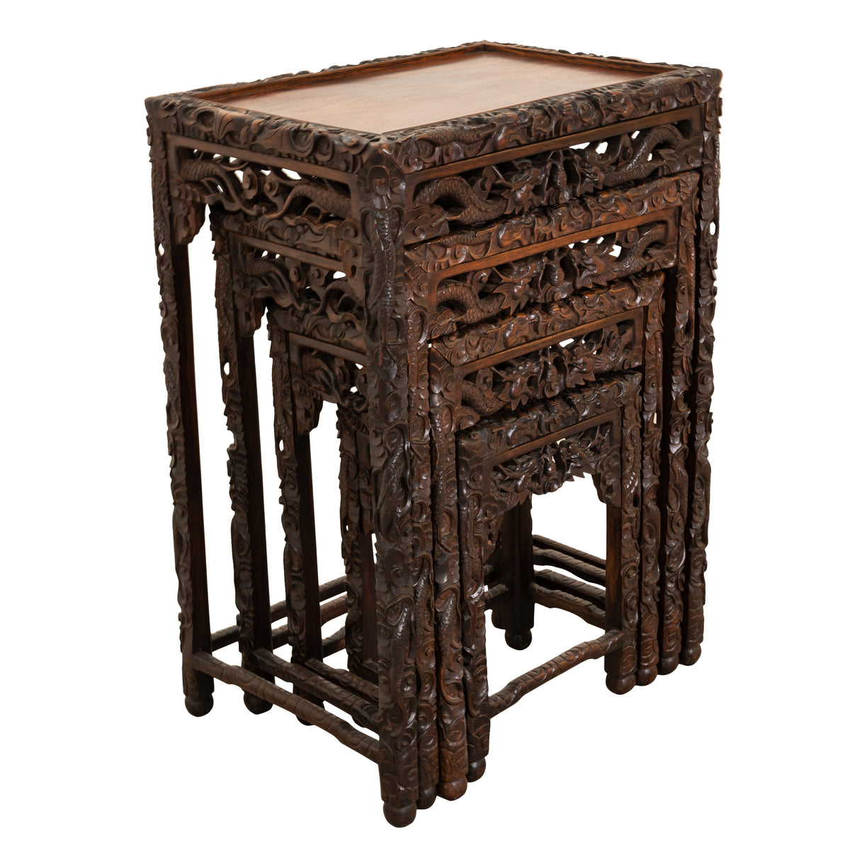 A fine set of four antique Chinese carved Qing dynasty rosewood dragon nesting tables, circa 1870.