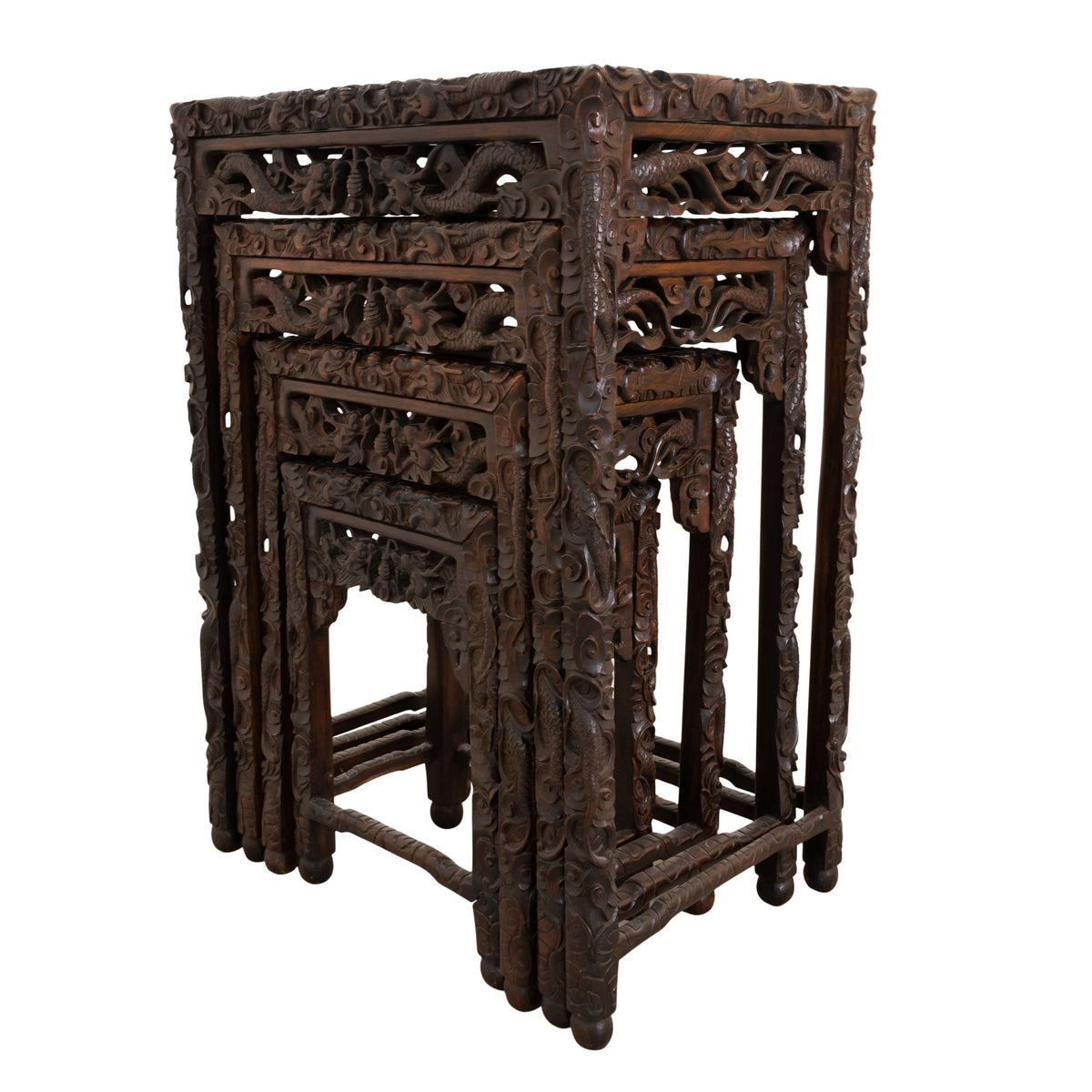 Each table is graduated in size and fits into the table above it, the tables are carved on all sides, including the table stretchers.
