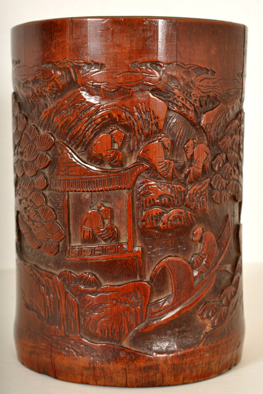 Antique Chinese Qing Dynasty Carved Bamboo Brush Pot, Circa 1850