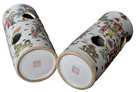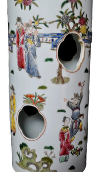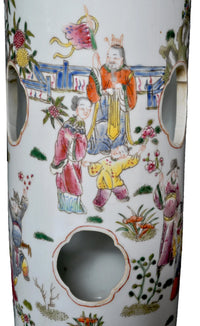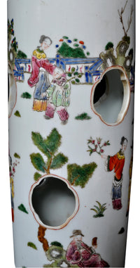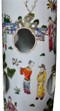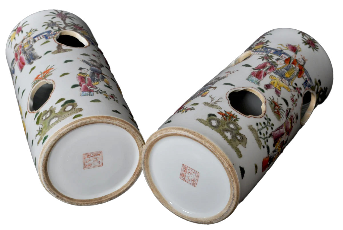 Pair of Qing Dynasty Antique Chinese Hat Vases, Circa 1880, decorated in the 'famille rose' palette of Imperial courtiers, with reticulated cutouts to each vase and with red Chinese character mark to the base.