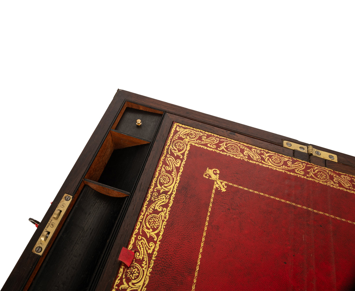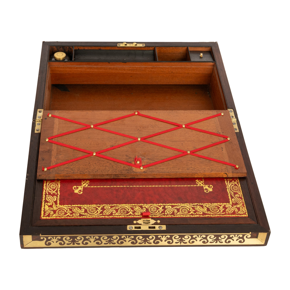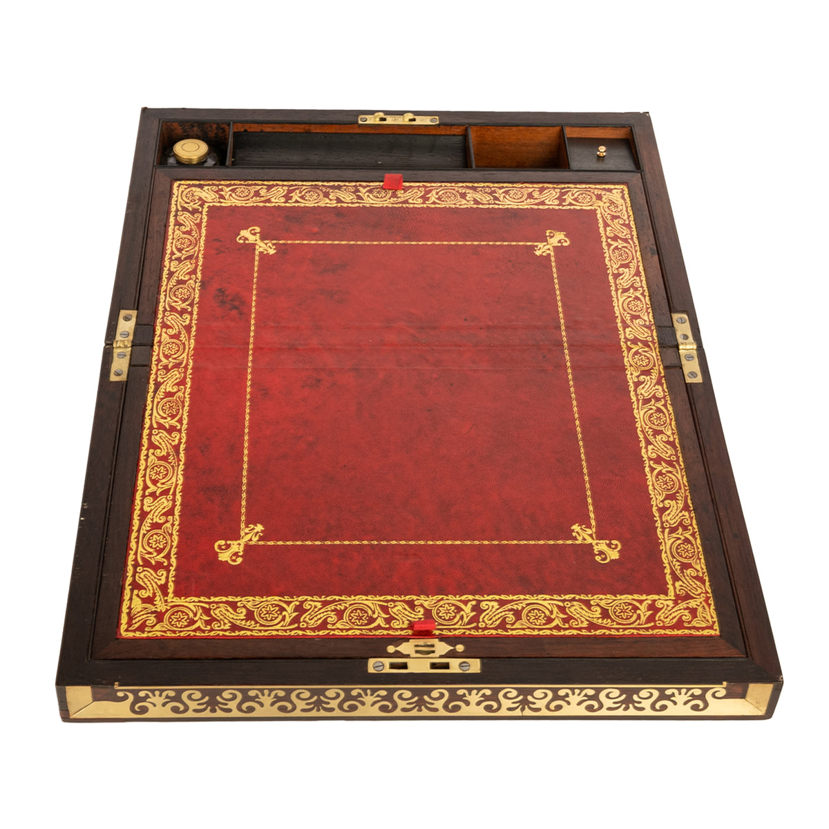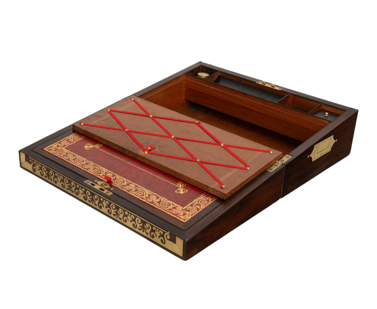 The box made from the finest figured rosewood and inlaid with brass in a foliate design, the writing box with campaign recessed handles on each side, the box has the original functioning lock and a key. The box opens to reveal a writing slope inlaid with a beautiful tooled and gilded Moroccan leather writing surface, the slope is hinged and both sides open to a storage reservoir. The writing box also has a fitted interior with a pen tray and storage to the underside and the original glass inkwell and several other storage areas.