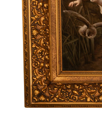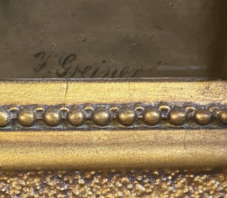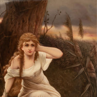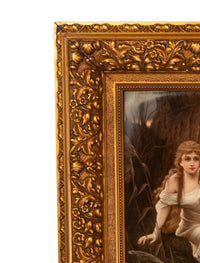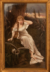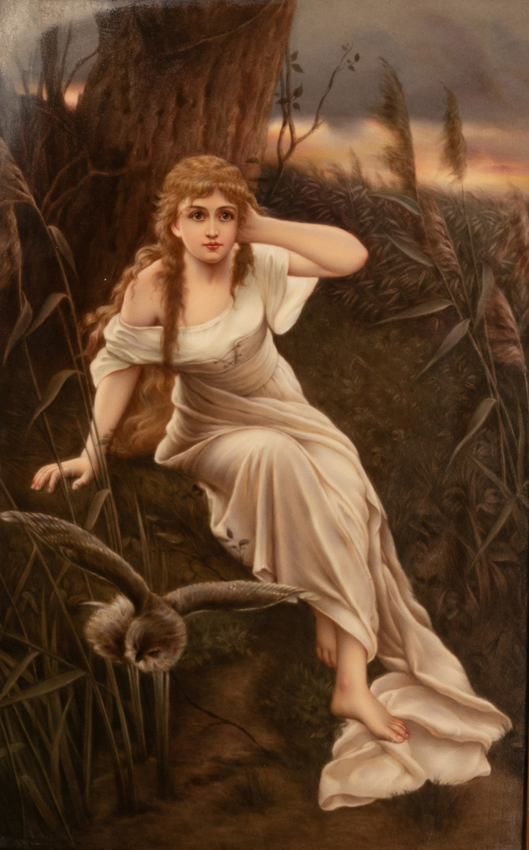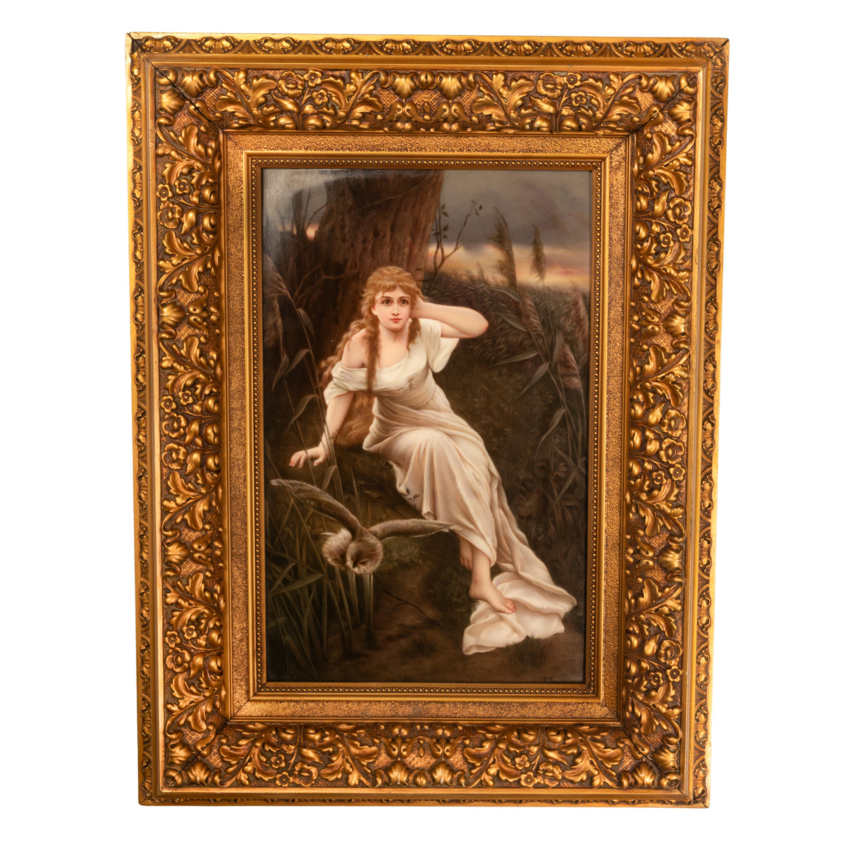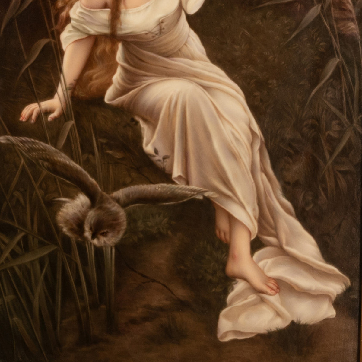 This very large plaque after the painting by Cuno von Bodenhausen (German, 1852-1931), a most unusual fantasy subject which received much press attention when it was exhibited in Germany in 1883. The painting represents a Cinderella type figure who was maltreated by her family and ran away to the forest only to be awoken by the sounds of fairies, she is portrayed seated on a hillside with her hand raised to her ear, as an owl lifts its wings in flight. The plaque is signed lower right "F. Greiner" (one of KPMs lead painters) impressed "K.P.M." with scepter mark. The plaque is housed in the original gilded gesso frame, both the plaque and frame are in excellent condition.