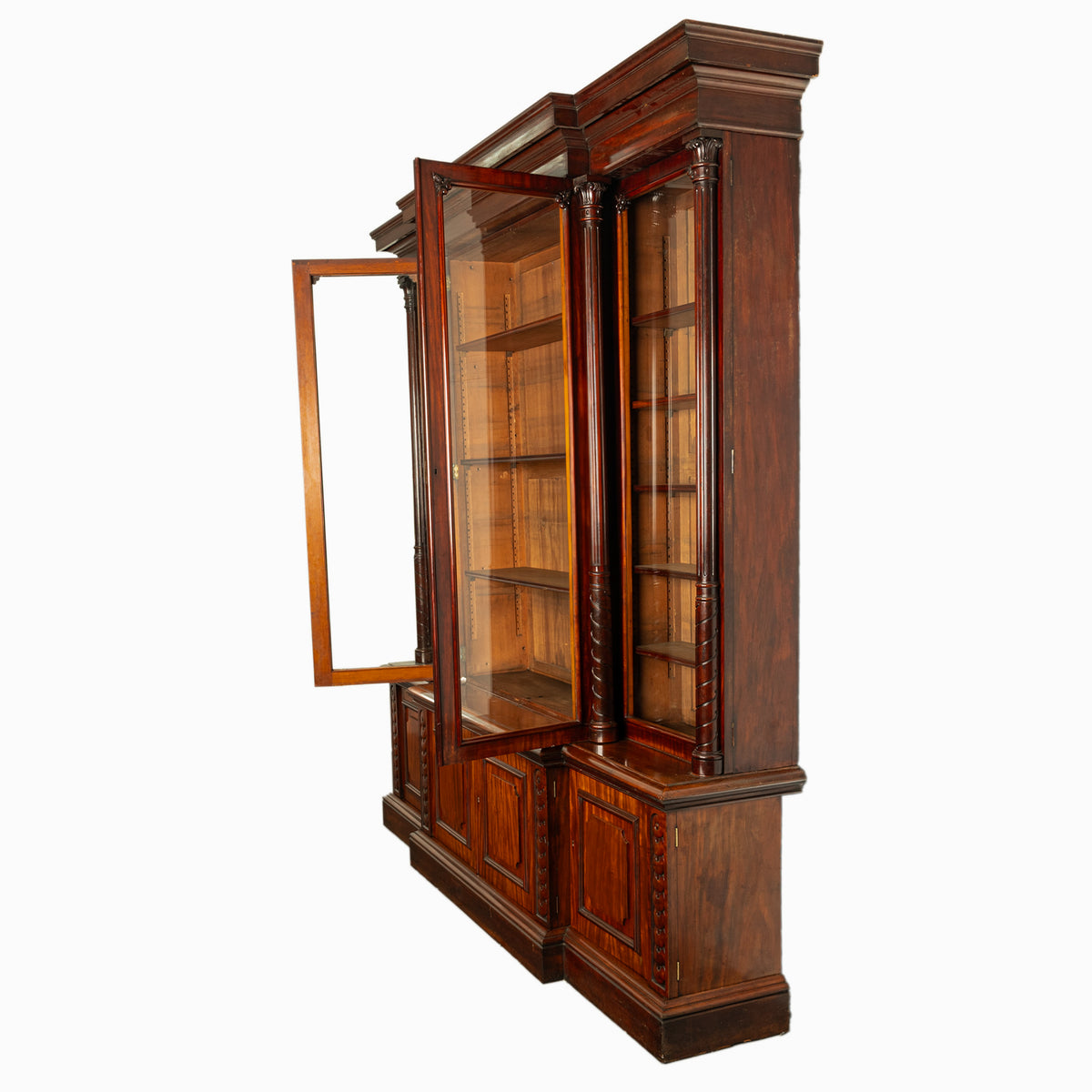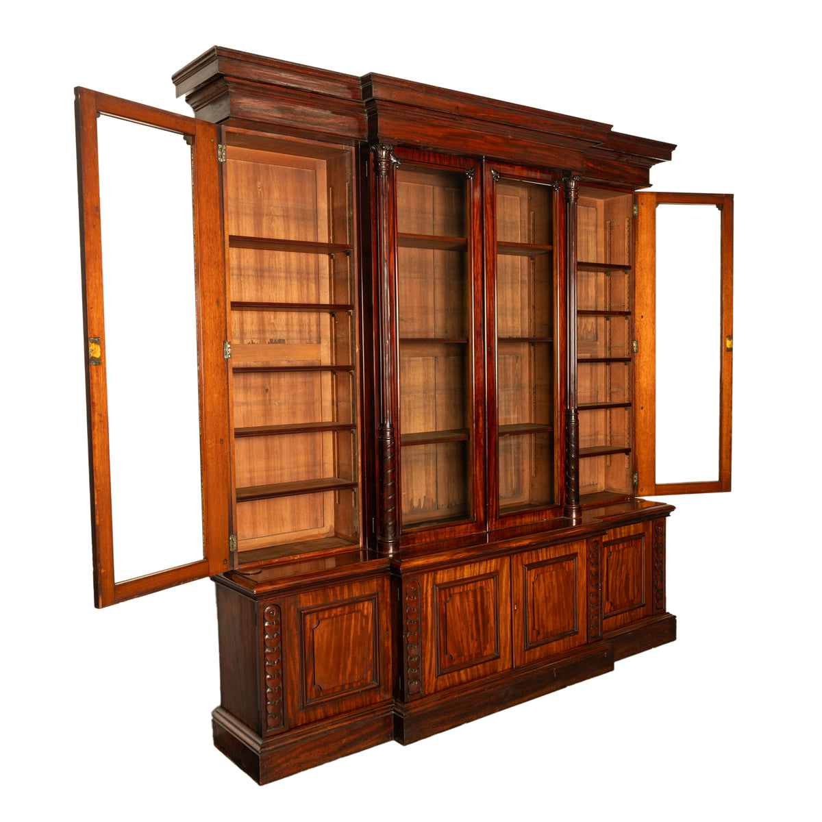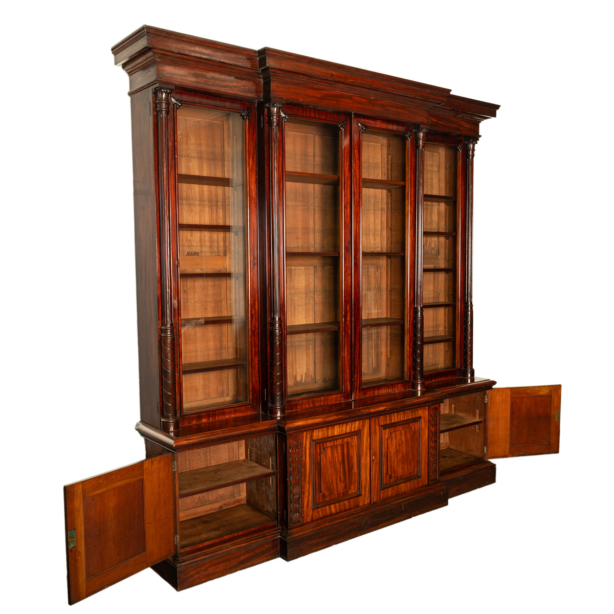The bookcase of break-fronted form disassembles into five sections for ease of movement, to the top is a stepped cornice with four glazed doors below, each door with a column support having a carved spiral base and a ribbed column above that is capped with a carved Corinthian capital. The glazed doors can all be locked and the original key is present, the doors enclose the original shelves, that can be adjusted for the total height of the bookcase and therefore can receive books of any size, including oversized books of large format.