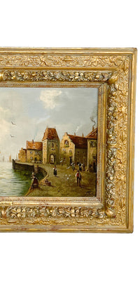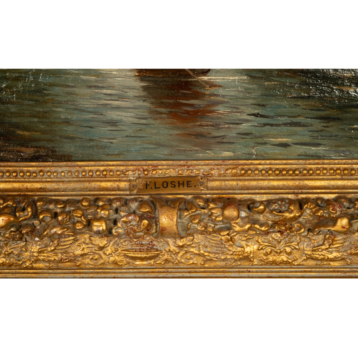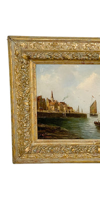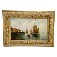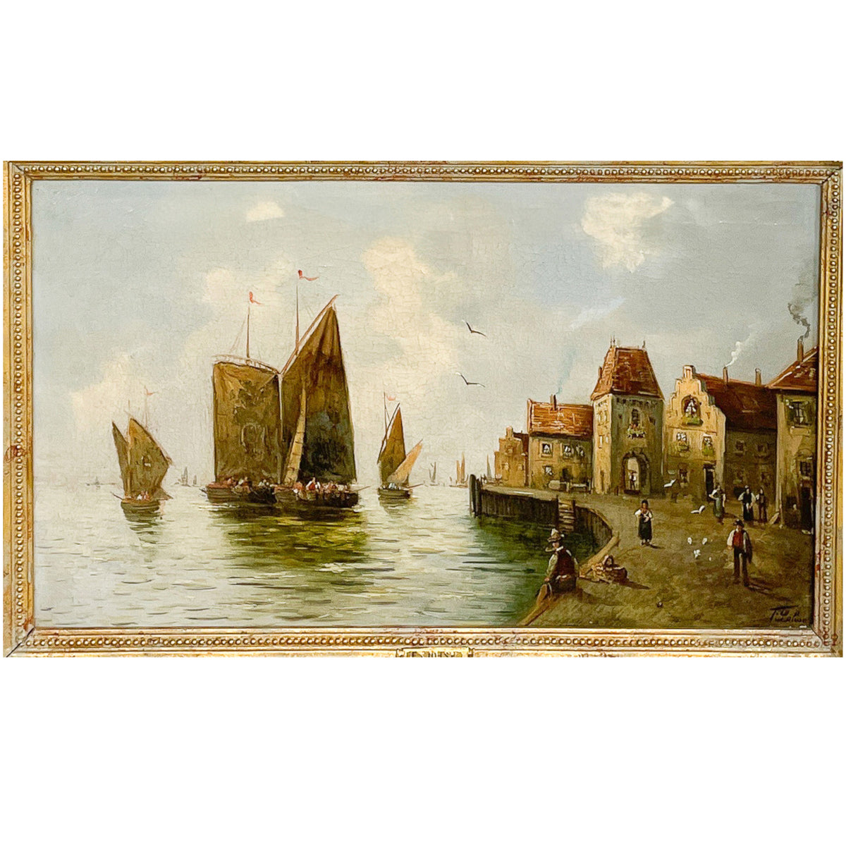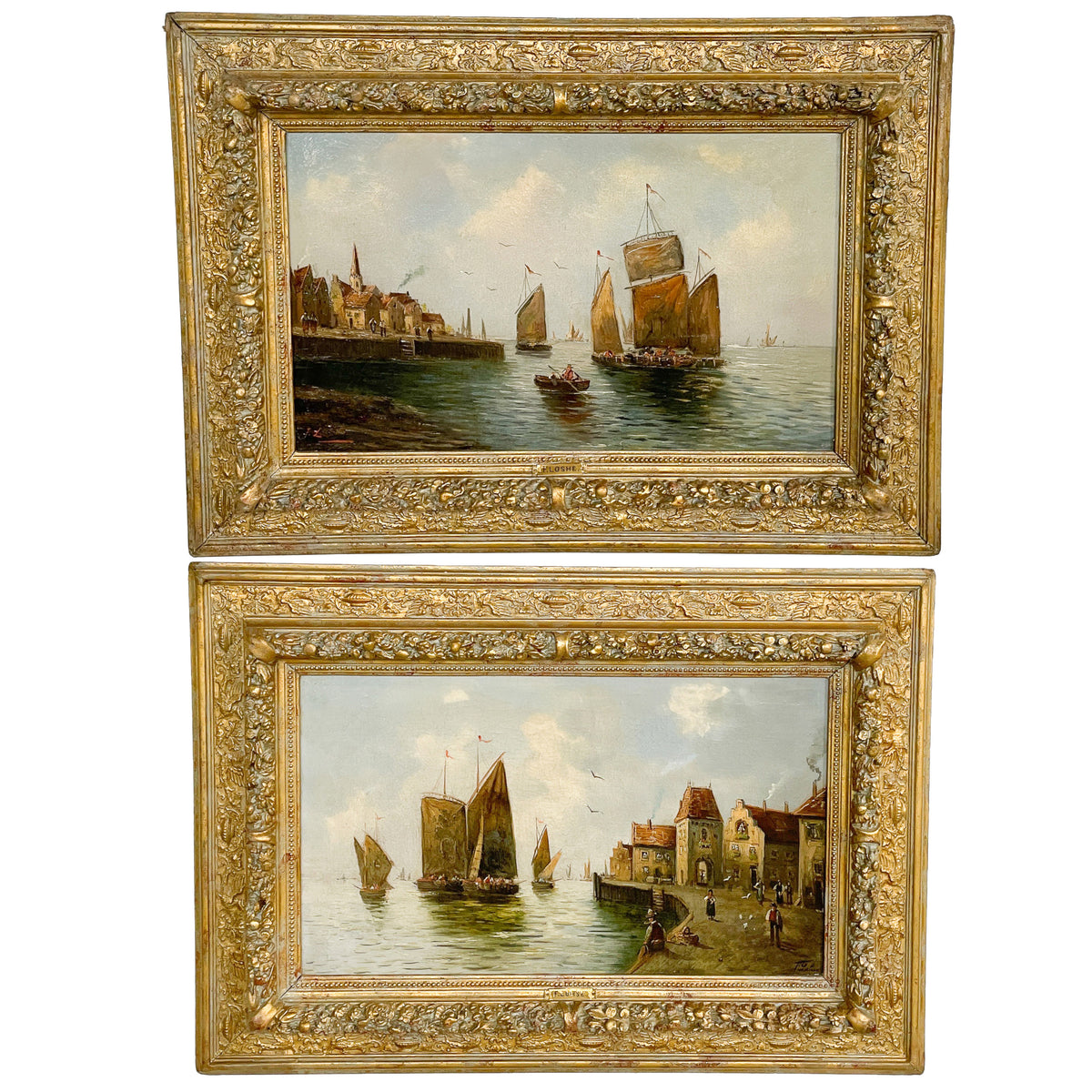 This very attractive pair of antique nautical paintings depict sailing ships in a Dutch harbor, each painting has a variety of vessels; tall ships, fishing boats and smaller vessels. The paintings also depict the harbor walls and the town behind, with many buildings and figures going about their business. Both paintings are signed "F. Lohse" and also having a name plaque to the frame, both paintings are housed in the original gilt gesso frame. The paintings have exhibition titled labels to the rear, translated as "Dutch Beach Scene" "#4086 & #4089", both paintings and frames are in very good condition and ready to hang on your wall.