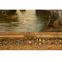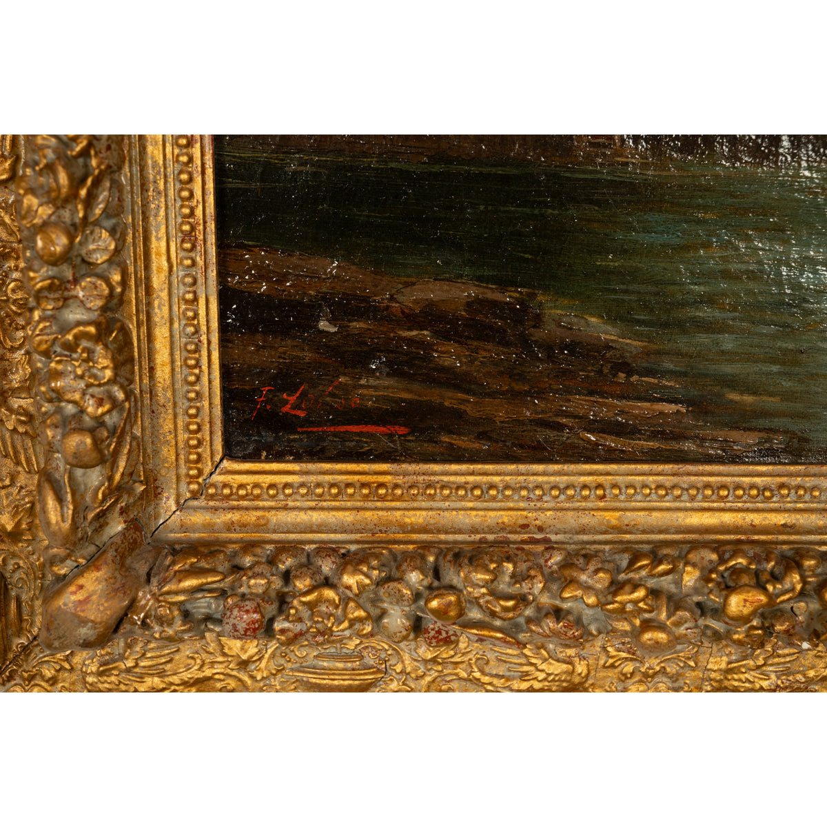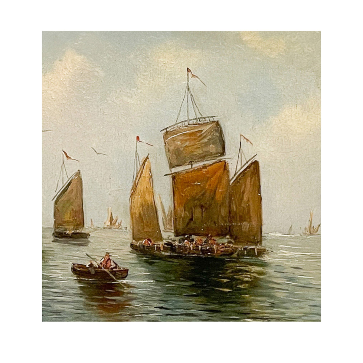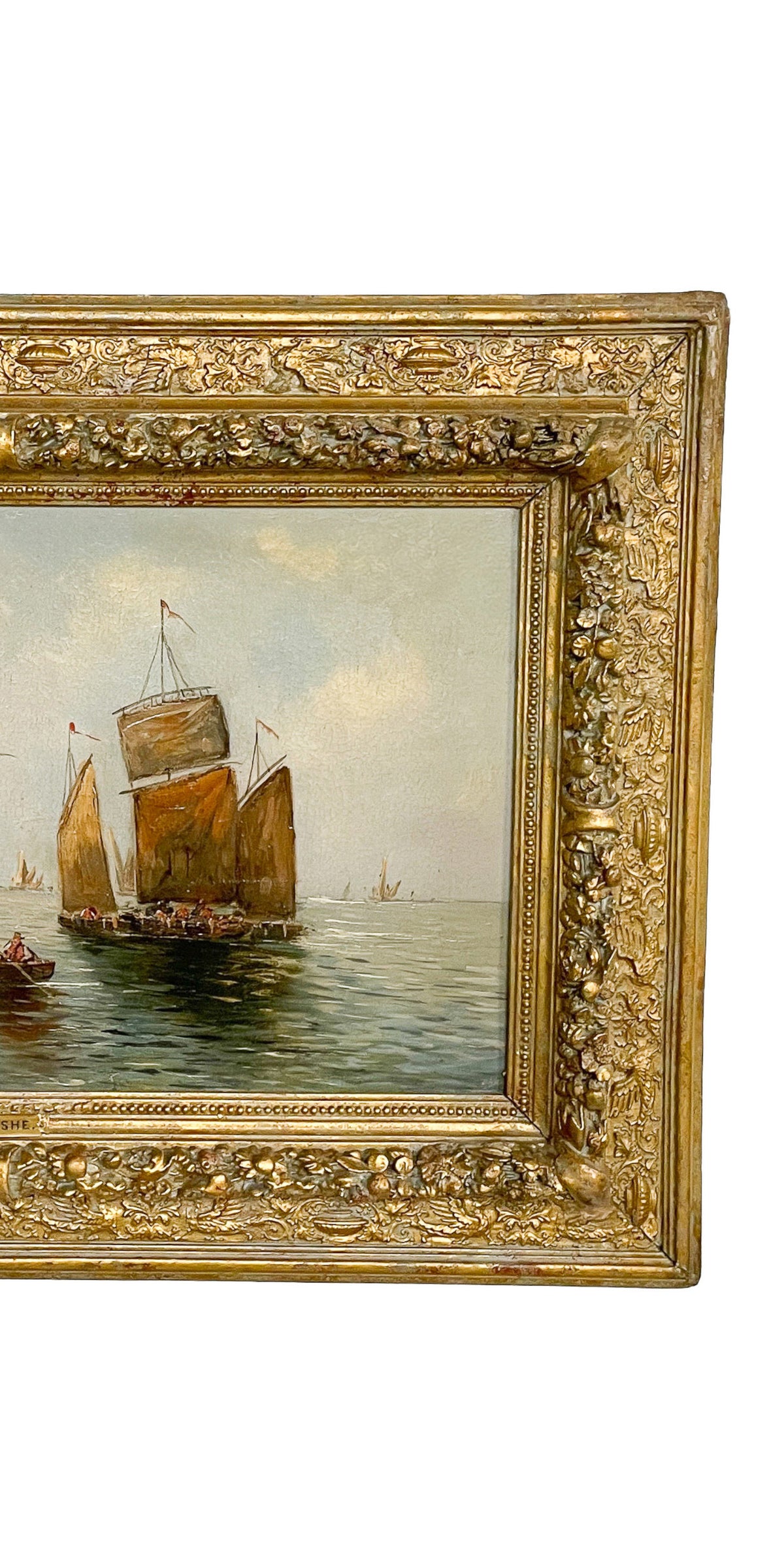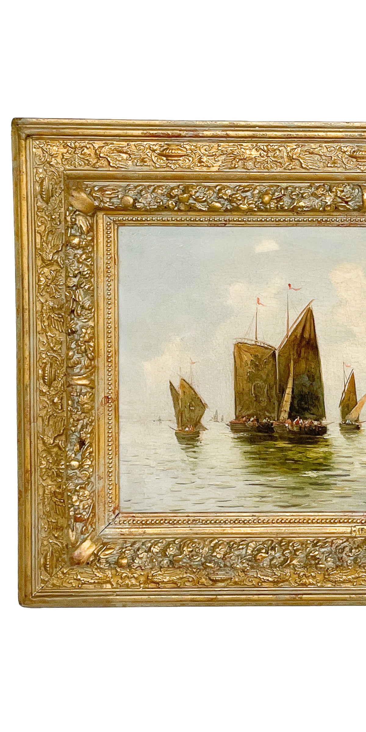 This very attractive pair of antique nautical paintings depict sailing ships in a Dutch harbor, each painting has a variety of vessels; tall ships, fishing boats and smaller vessels. The paintings also depict the harbor walls and the town behind, with many buildings and figures going about their business. Both paintings are signed "F. Lohse" and also having a name plaque to the frame, both paintings are housed in the original gilt gesso frame. The paintings have exhibition titled labels to the rear, translated as "Dutch Beach Scene" "#4086 & #4089", both paintings and frames are in very good condition and ready to hang on your wall.
