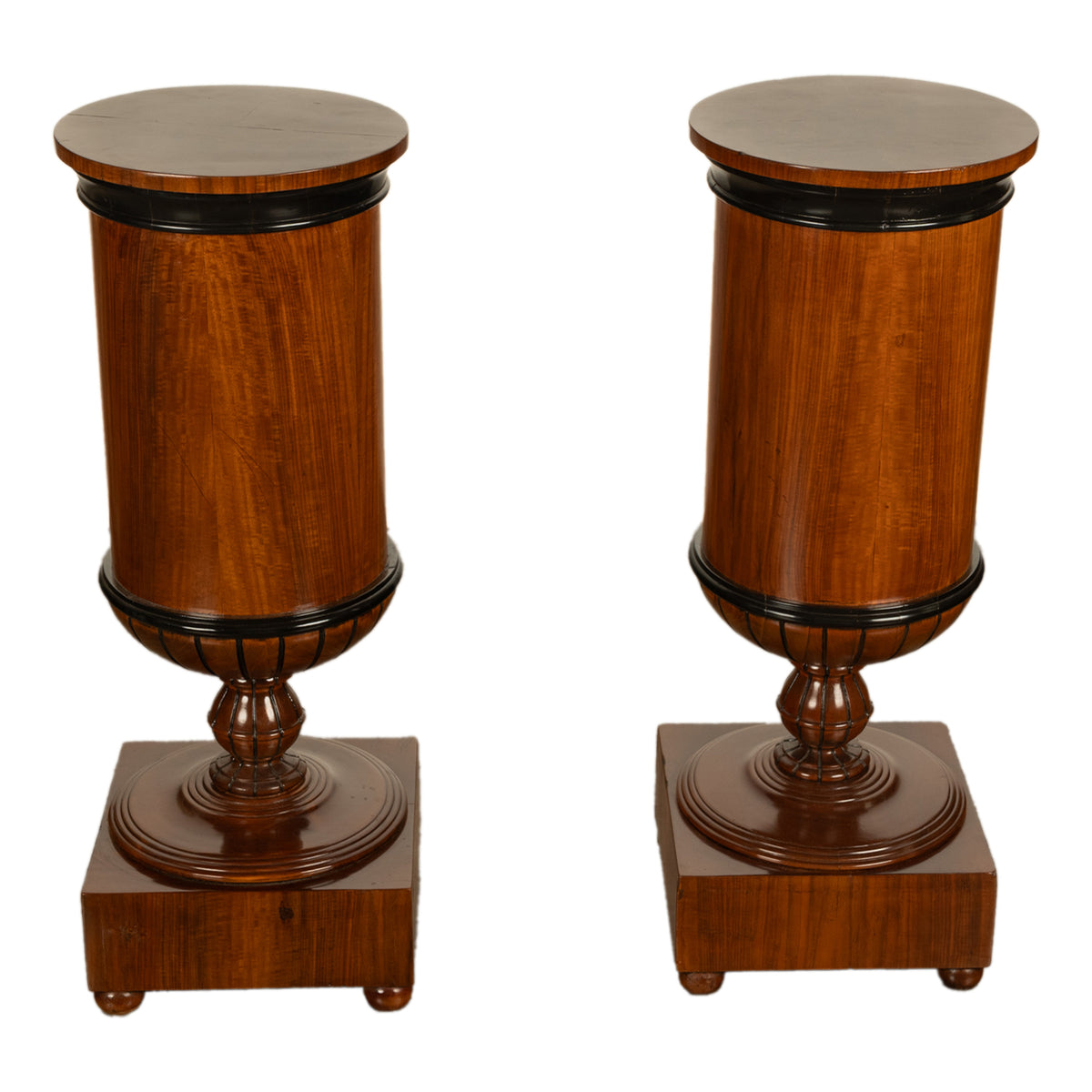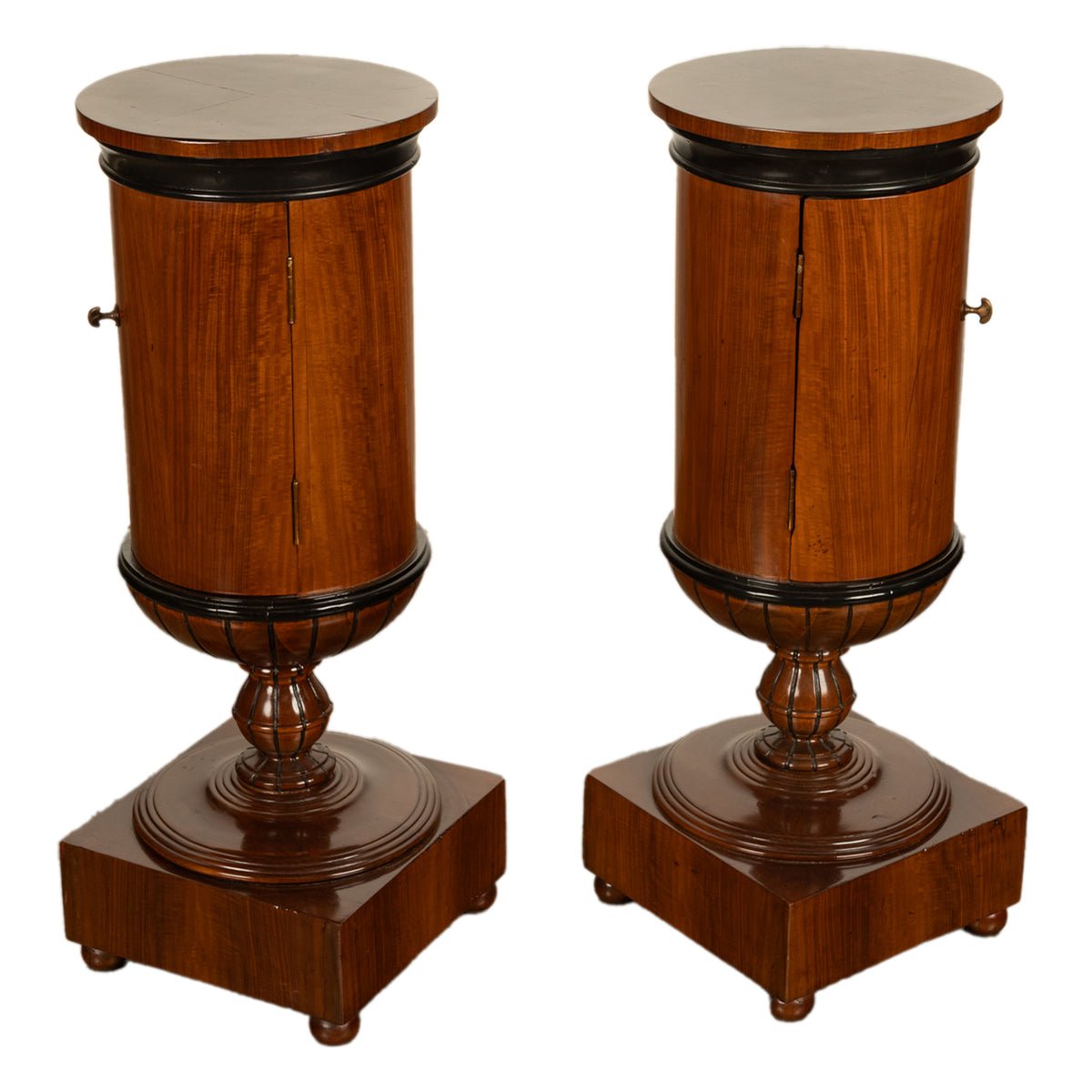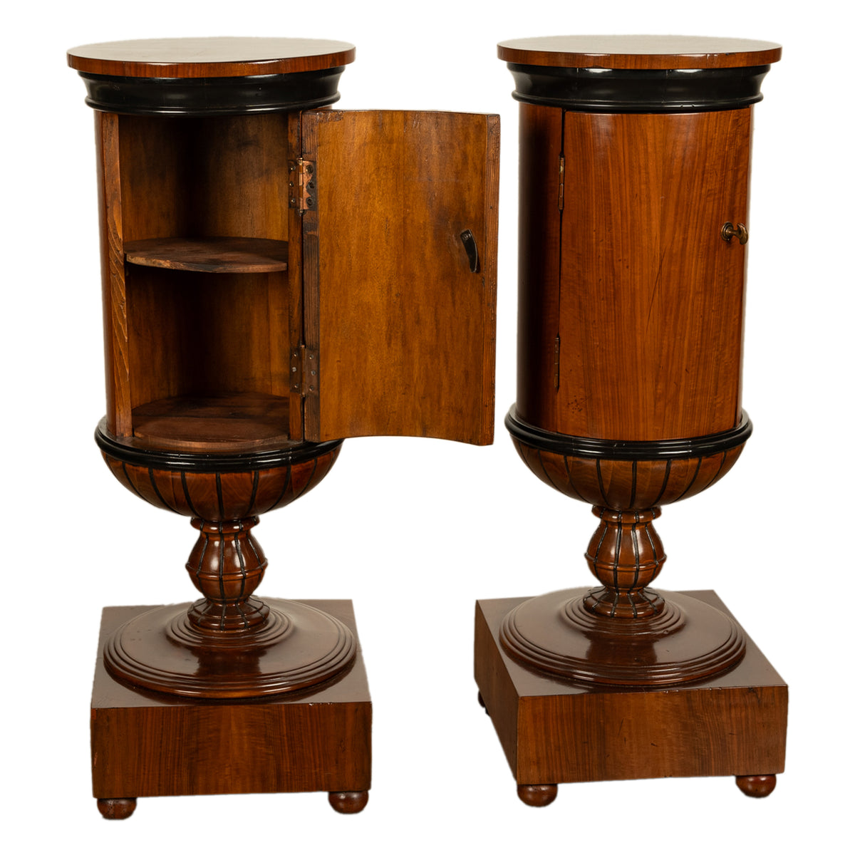 Pair Antique Austrian Walnut Biedermeier Drum Pedestal Cabinets Nightstands 1830