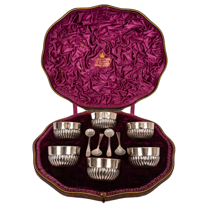 Antique English Mappin & Webb Sterling Silver Salts & Spoons Set in Case 1886