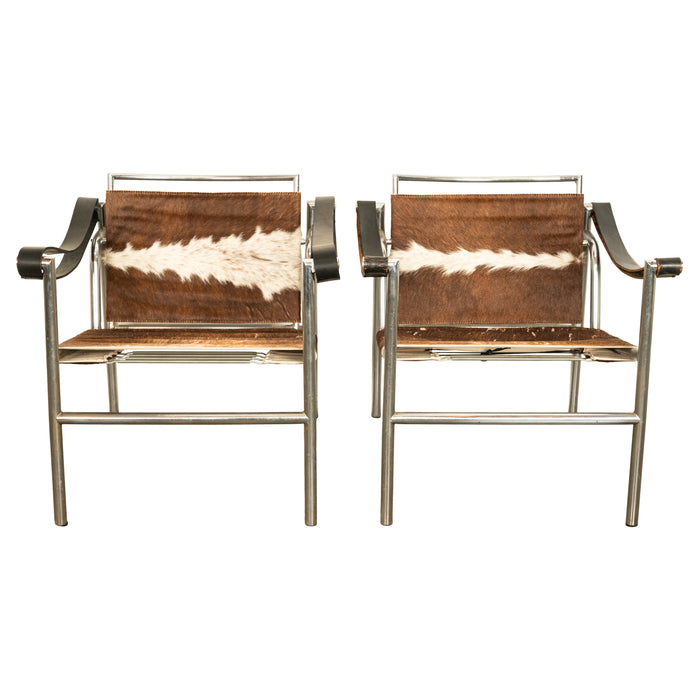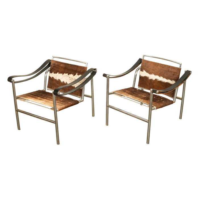 Pair Bauhaus Basculant LC1 Sling Armchairs Le Corbusier Cow Hide Cassina 1960s