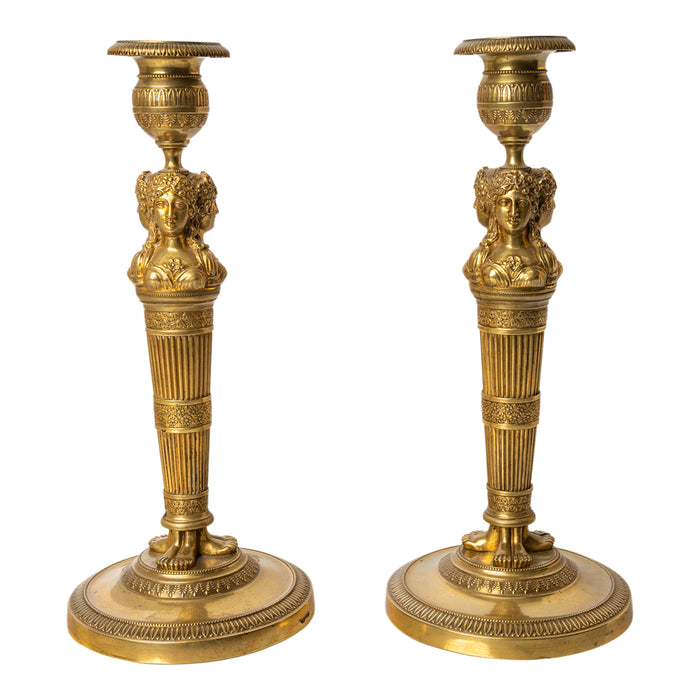 Pair Antique Early 19thC French Empire Neoclassical Gilt Bronze Candlesticks
