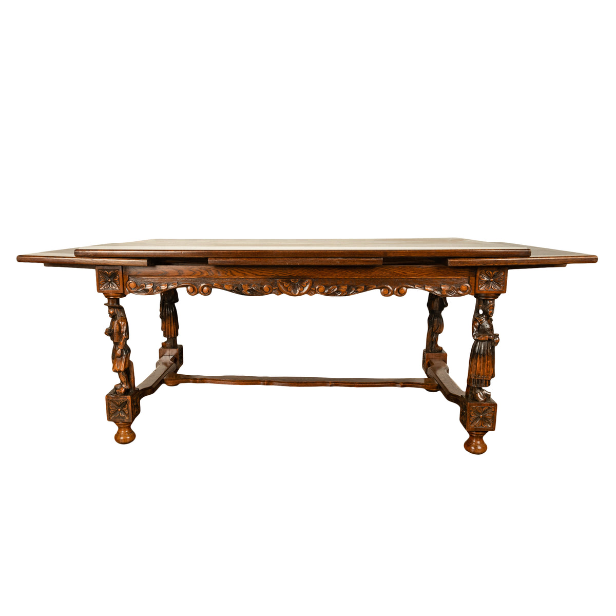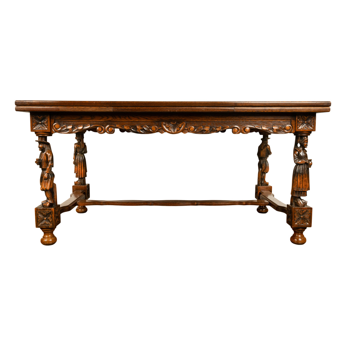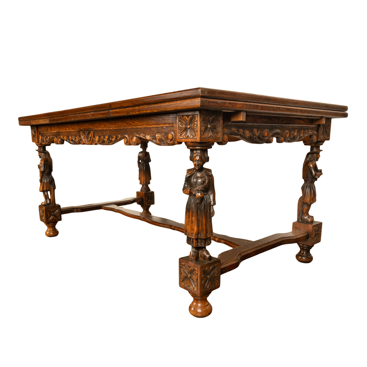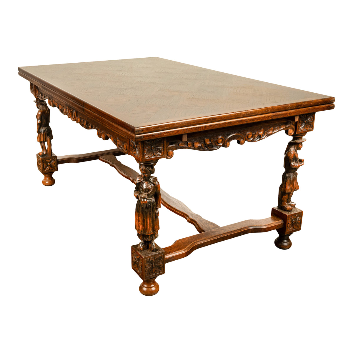 The table having a draw leaf at each end that extends to 101", the table could seat up to 12 people, the top and leaves are inlaid with a geometric parquetry design. The base having a carved skirt, at each corner there is a block carved with a pair of stylized flowers and to the center is a carved figure (one male one female at both ends) depicting a Breton in traditional dress, the figures stand on corresponding blocks and joined with a 'H' frame stretcher, the table is raised on compressed bun feet.