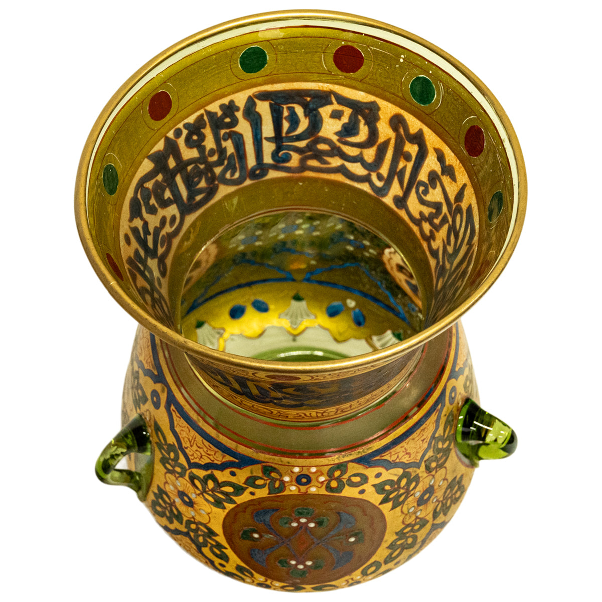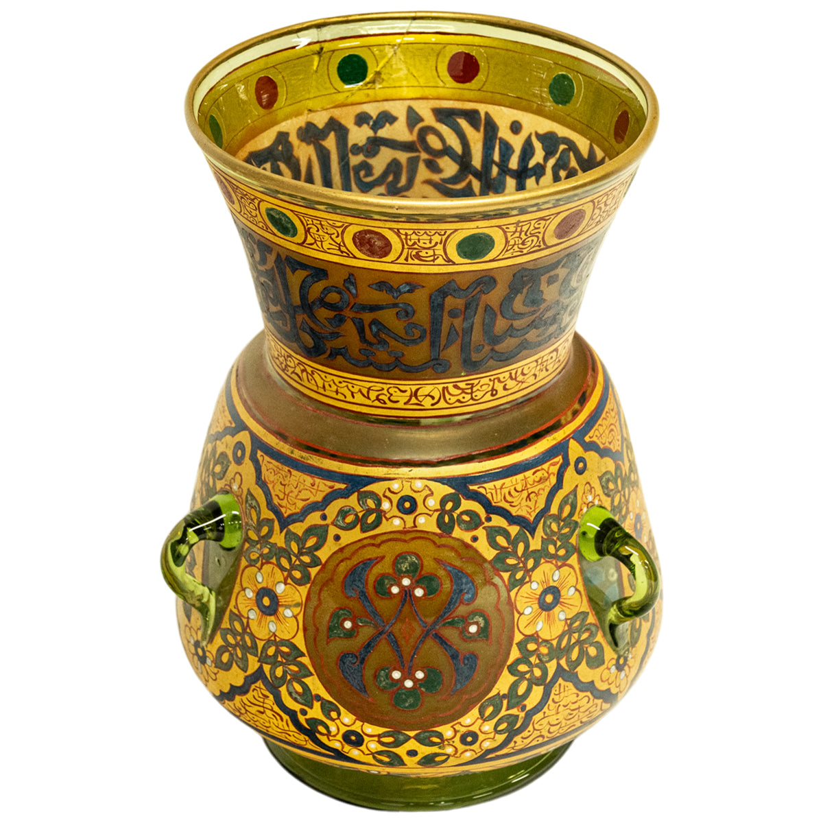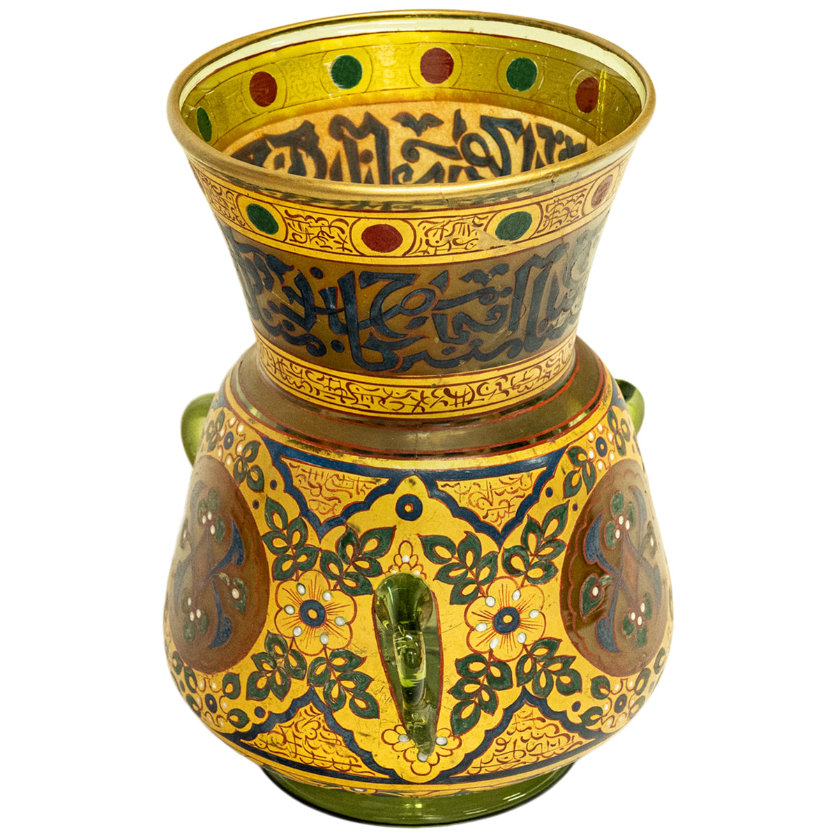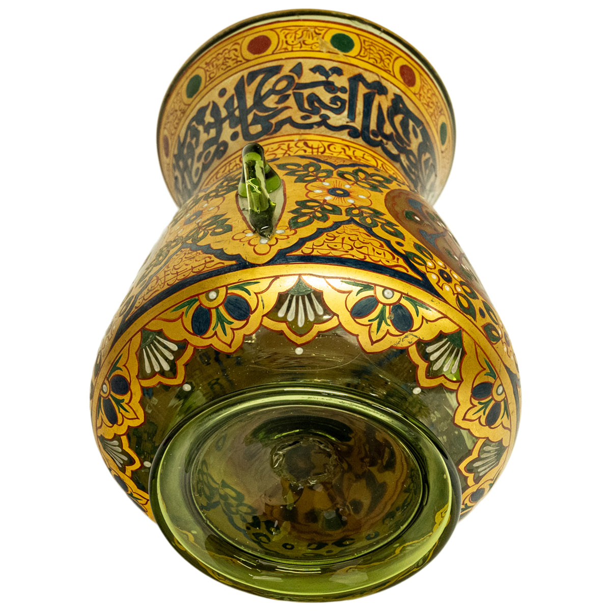 The hand-blown glass lamp having a bulbous body with a tapered neck & flaring mouth, standing on a compressed foot. The neck decorated with two bands of gilding with pseudo script & alternating red & green circular devices. the neck also having a large blue band of blue continuous Thuluth script on a red background. The base of the lamp also heavily gilded & having colorful floral decoration & hand-painted enamel raised 'gems', the lamp having three suspension handles punctuated with three large blue floral motifs on terracotta cartouche. The underside of the base is gilded & decorated with polychrome lappets, the lamp with a raised pontil mark to the base.