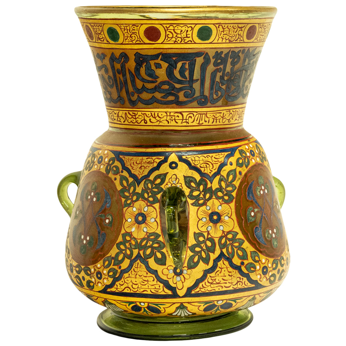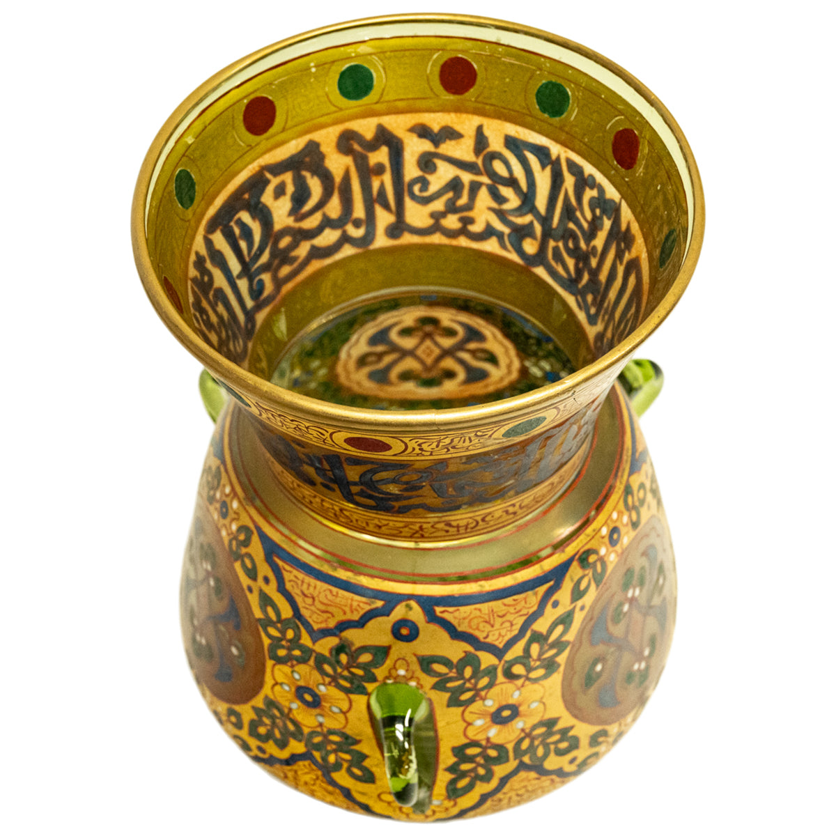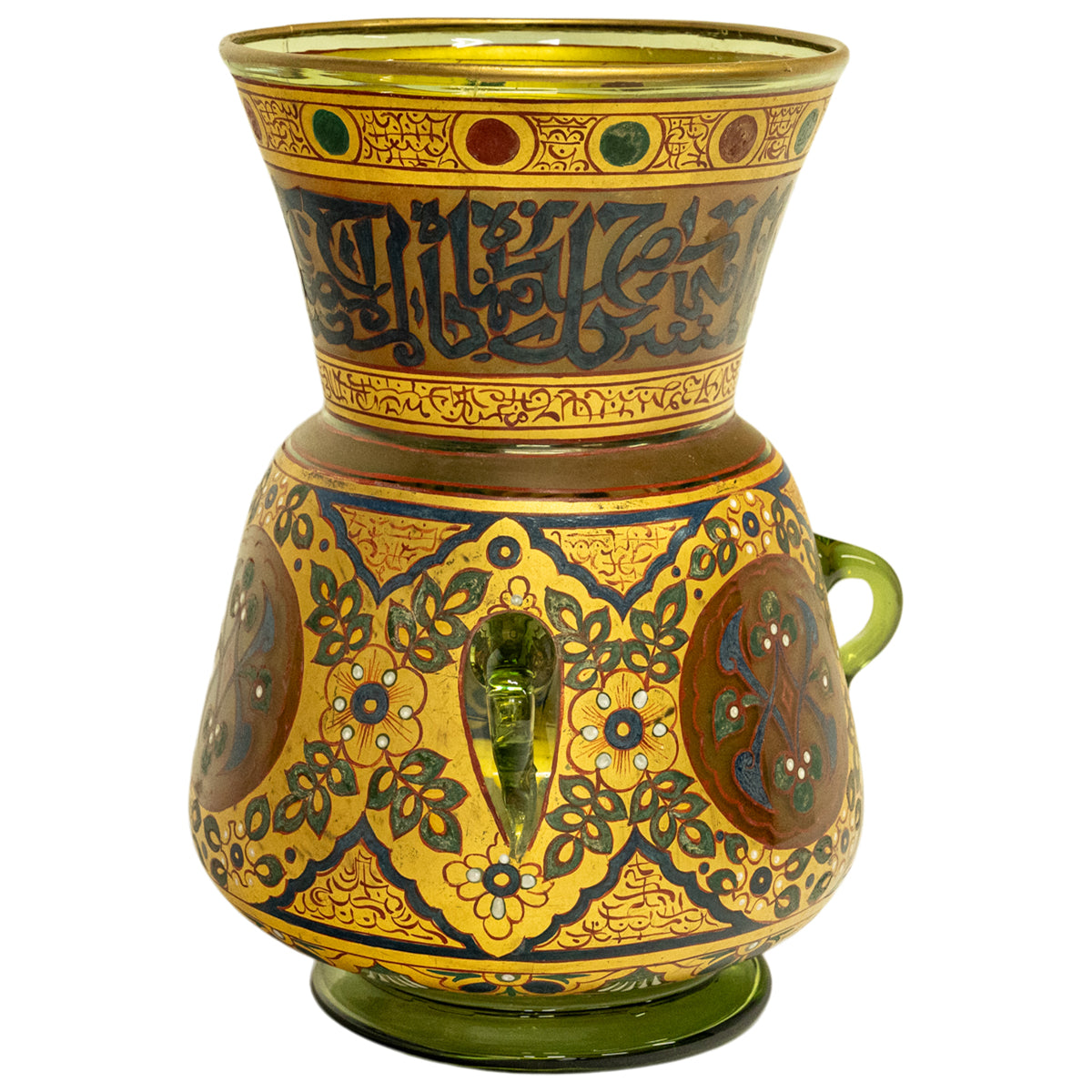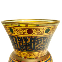 The hand-blown glass lamp having a bulbous body with a tapered neck & flaring mouth, standing on a compressed foot. The neck decorated with two bands of gilding with pseudo script & alternating red & green circular devices. the neck also having a large blue band of blue continuous Thuluth script on a red background. The base of the lamp also heavily gilded & having colorful floral decoration & hand-painted enamel raised 'gems', the lamp having three suspension handles punctuated with three large blue floral motifs on terracotta cartouche. The underside of the base is gilded & decorated with polychrome lappets, the lamp with a raised pontil mark to the base.