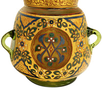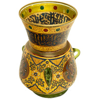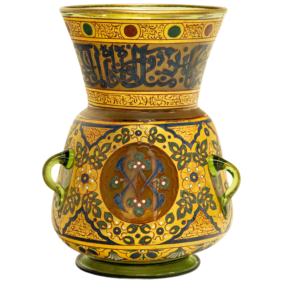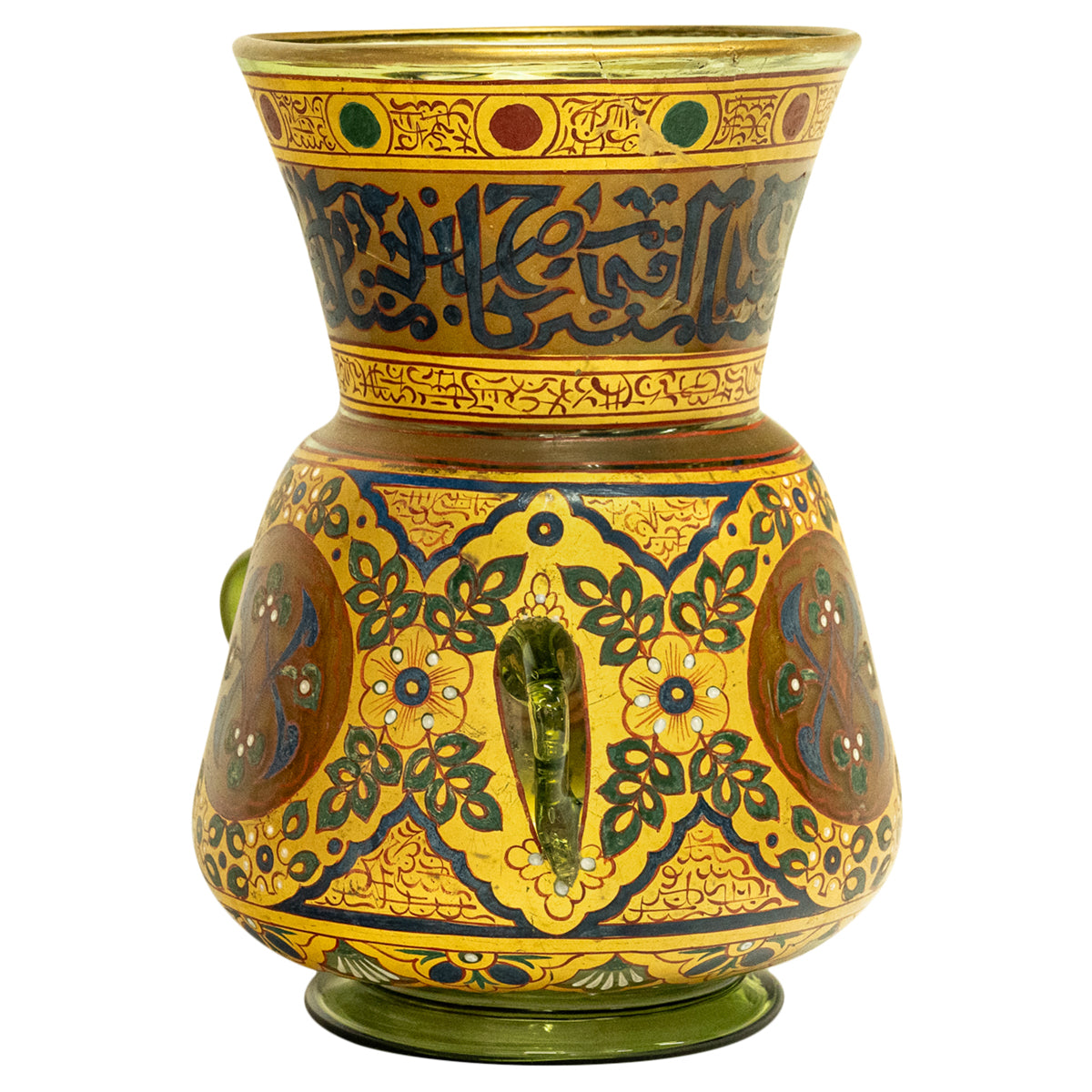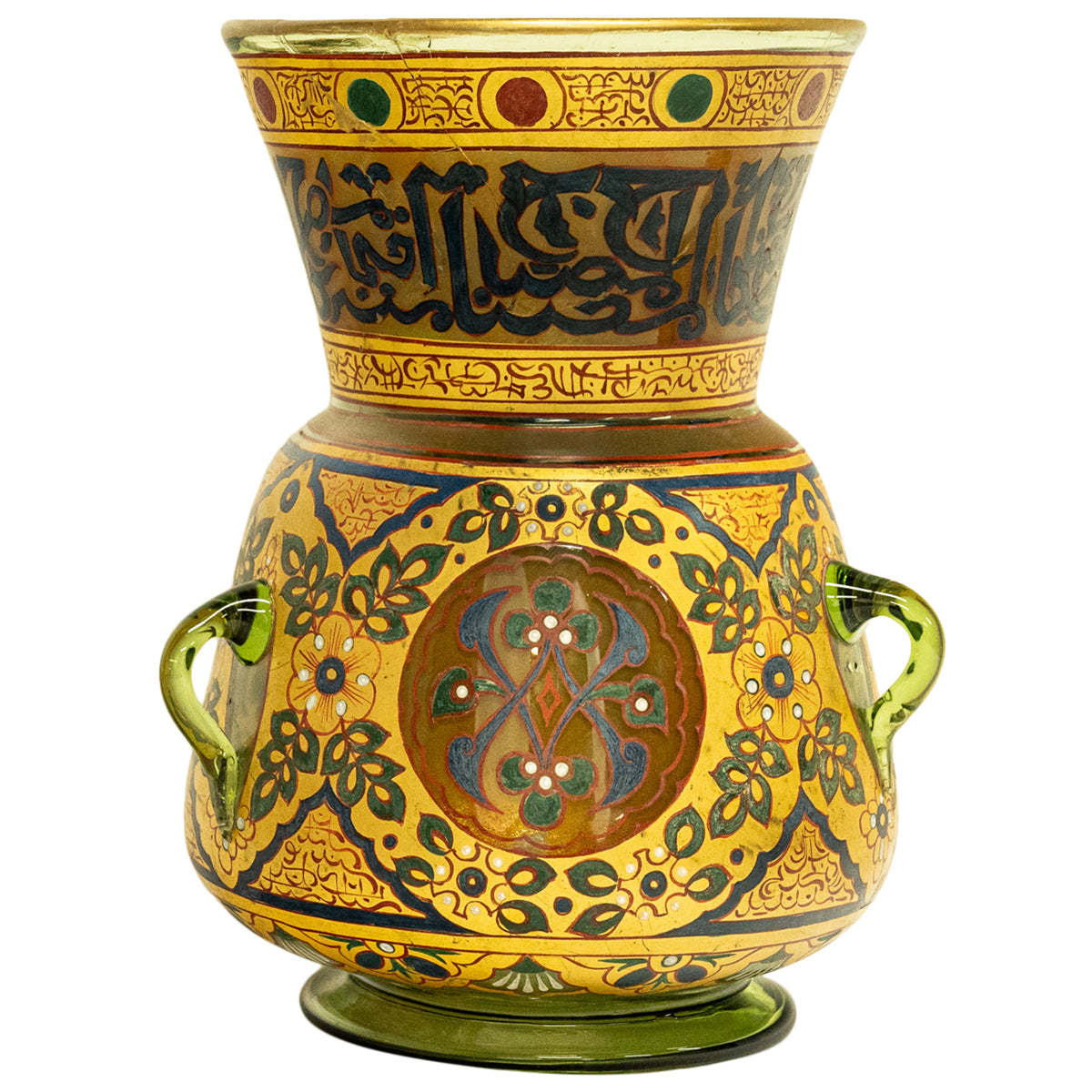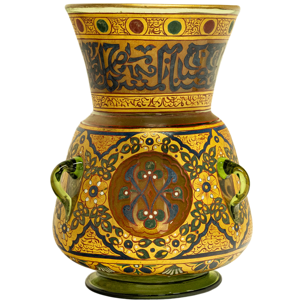 The hand-blown glass lamp having a bulbous body with a tapered neck & flaring mouth, standing on a compressed foot. The neck decorated with two bands of gilding with pseudo script & alternating red & green circular devices. the neck also having a large blue band of blue continuous Thuluth script on a red background. The base of the lamp also heavily gilded & having colorful floral decoration & hand-painted enamel raised 'gems', the lamp having three suspension handles punctuated with three large blue floral motifs on terracotta cartouche. The underside of the base is gilded & decorated with polychrome lappets, the lamp with a raised pontil mark to the base.