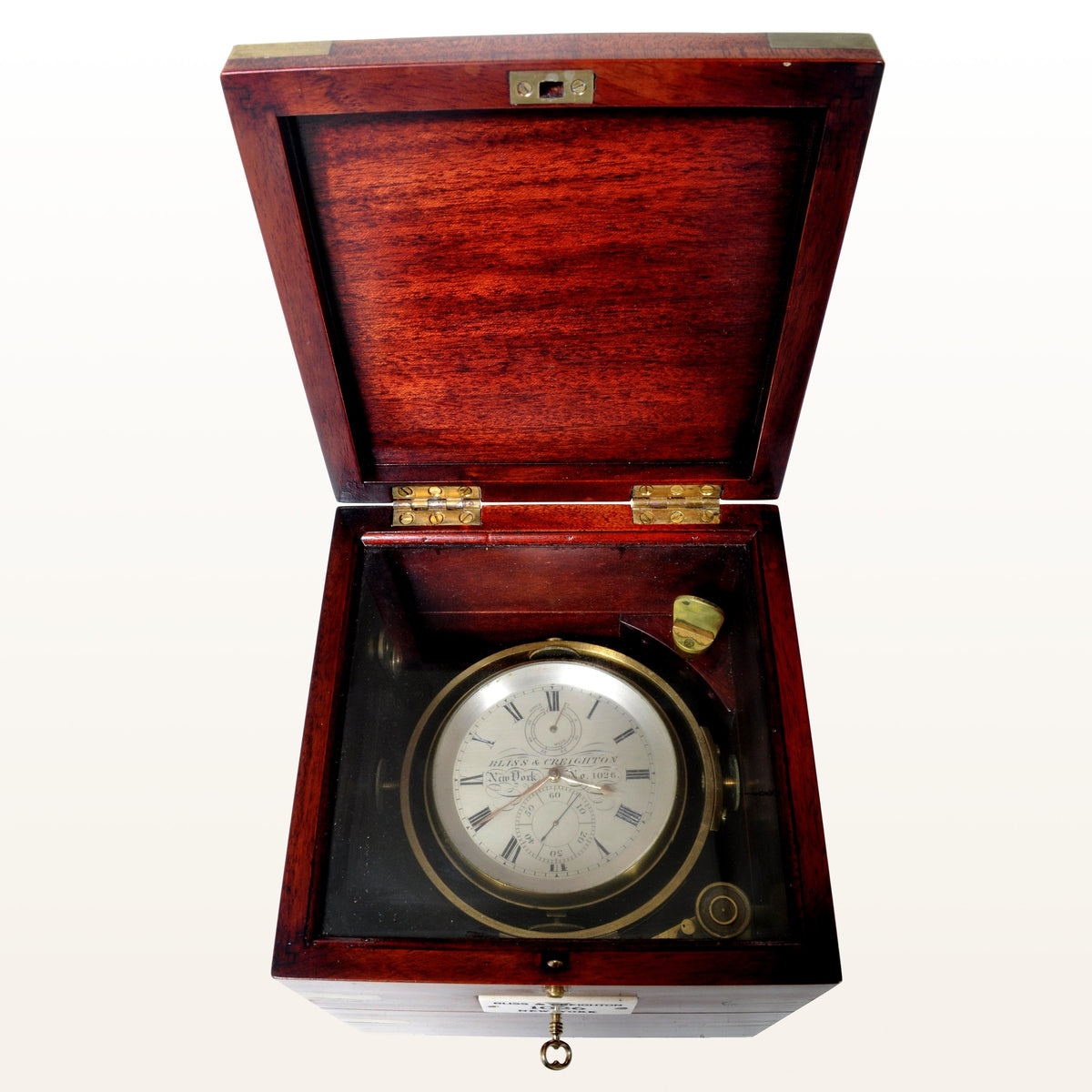 (Sold) Eight Day American Marine Chronometer, Bliss & Creighton, circa 1855. Engraved silvered dial signed Bliss and Creighton, New York, having black Roman numerals in a gimbaled brass housing and housed in a brass-bound mahogany case.