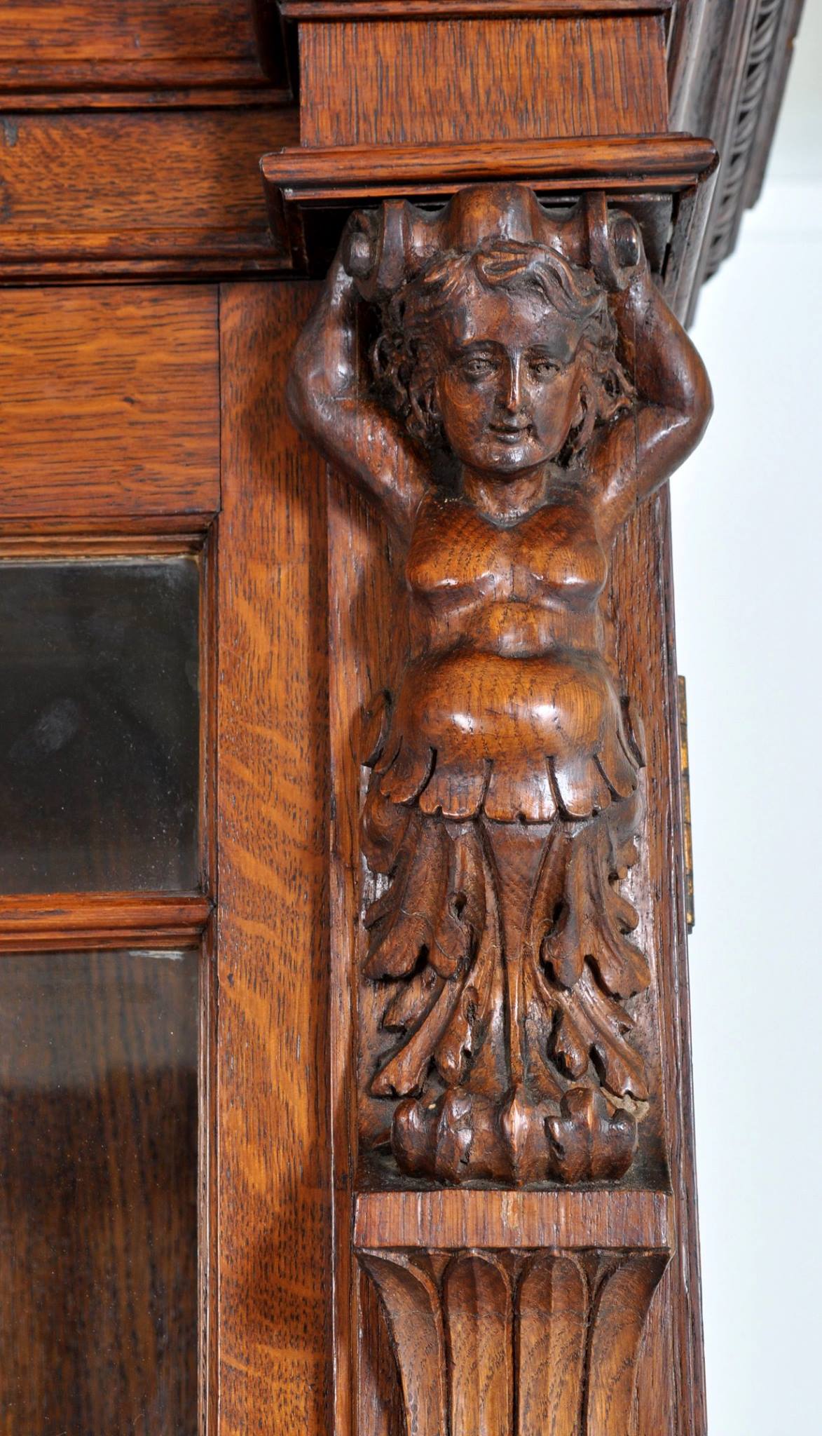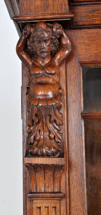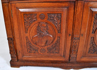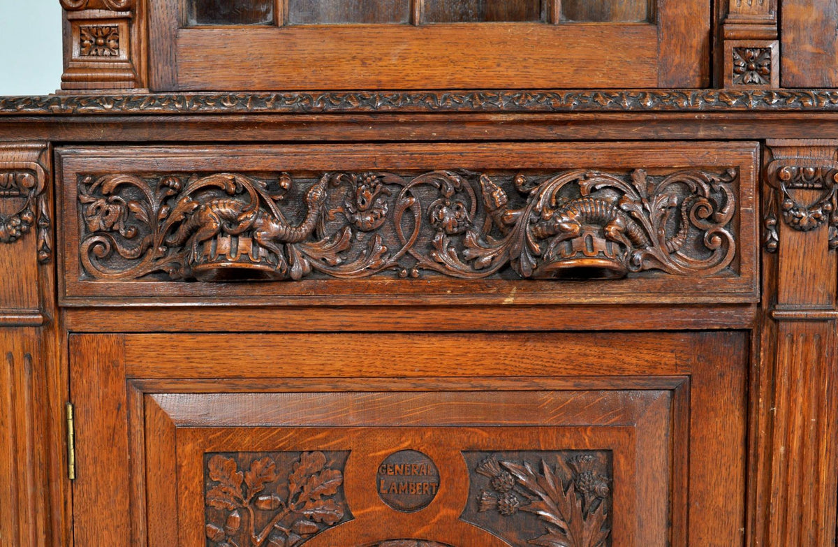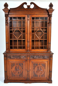 Fine Antique Bookcase. Mid-19th century neoclassical style, carved with English civil war period personages (General Lambert and John Hampton), circa 1860.