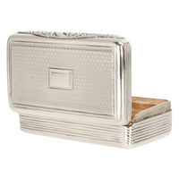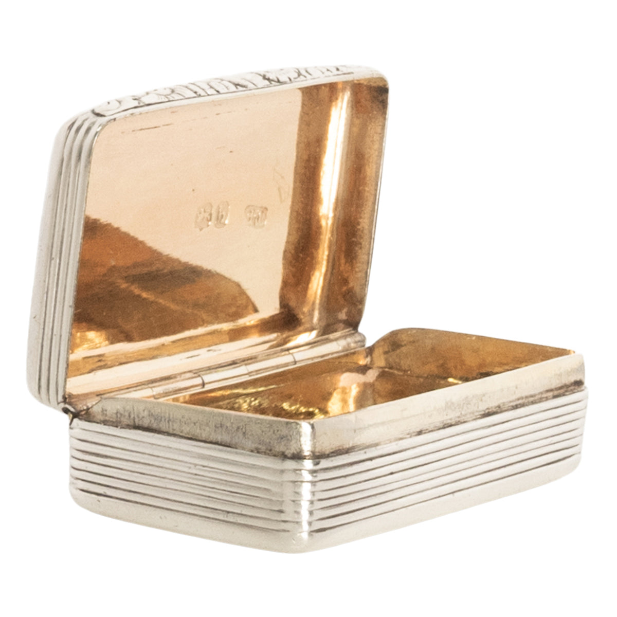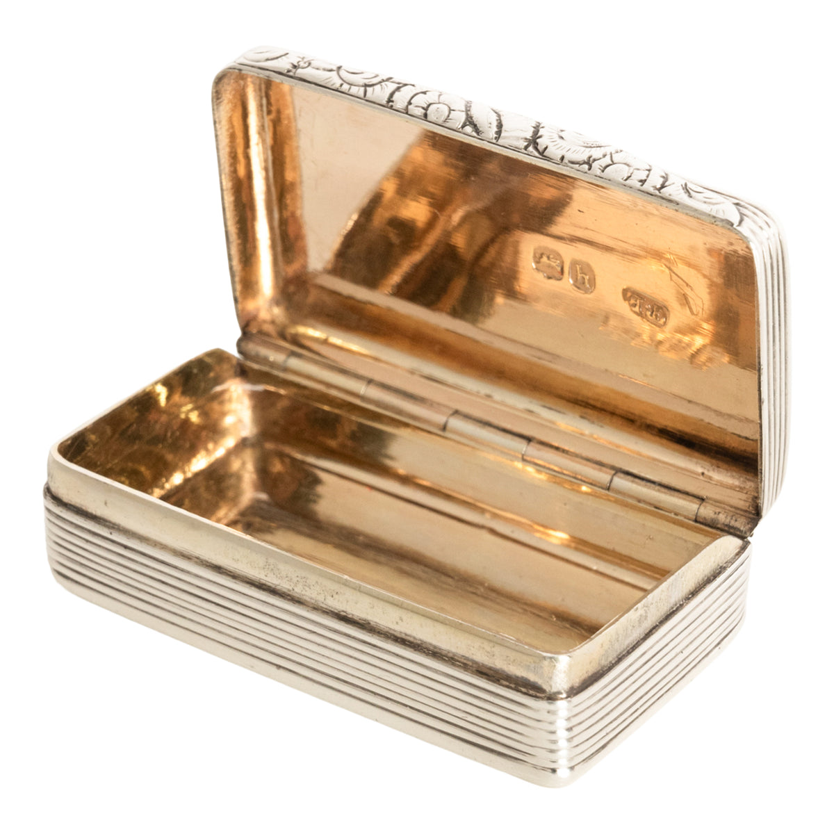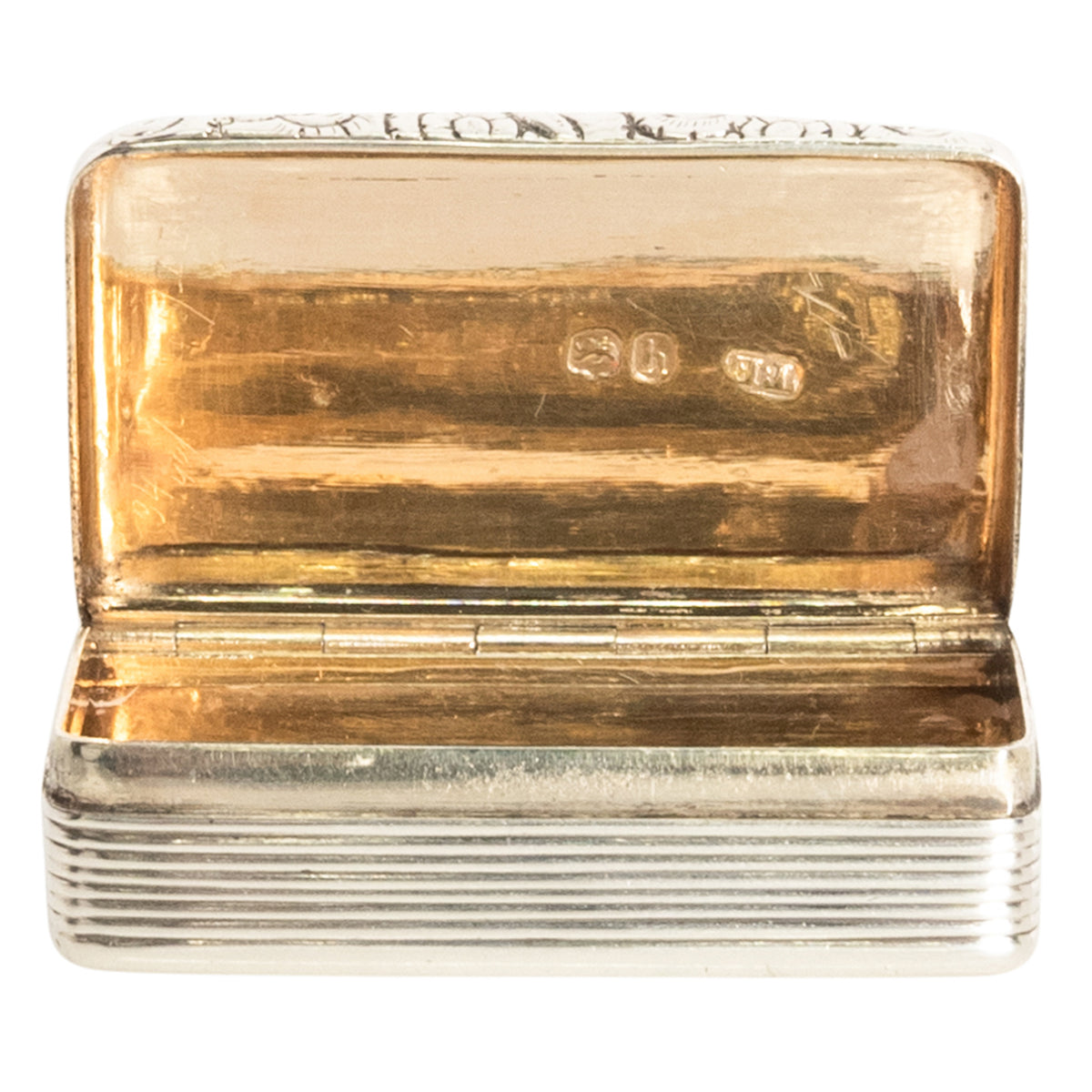 The egdes of the box having a ribbed design and the interior with gilt decoration. Hallmarked twice to the interior, base and top, with Thomas Evans mark and the date letter for 1783, the panther mask for London and the head of the monarch George III, and lion passant for sterling silver. The box is in excellent condition, no damage or repair, a truly outstanding example of a Georgian sterling silver snuff box.