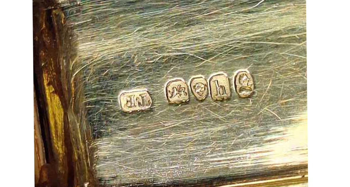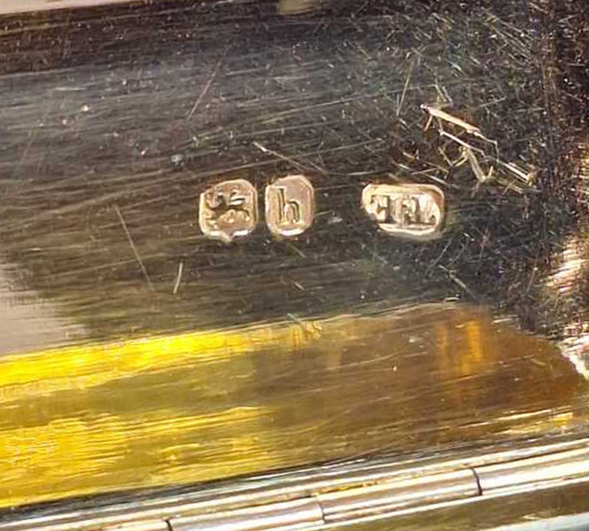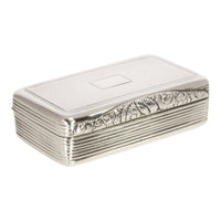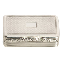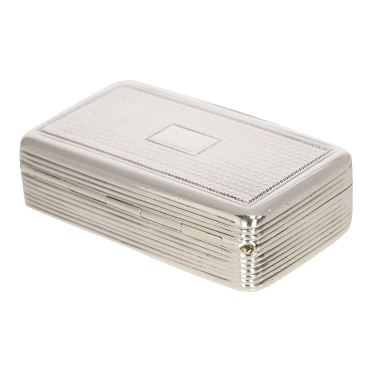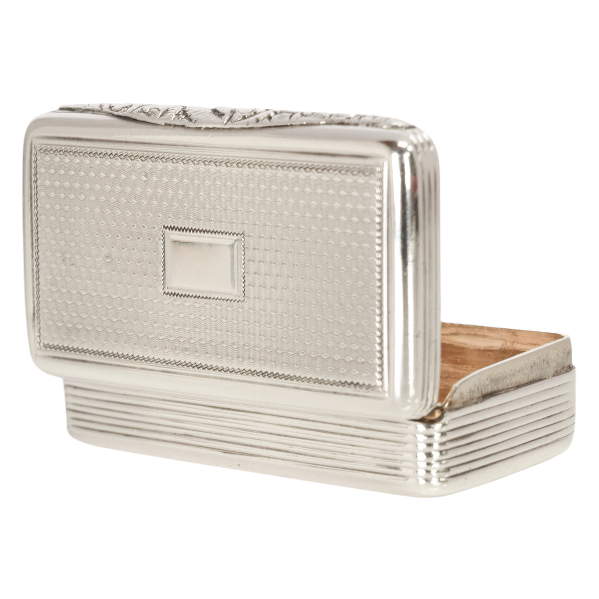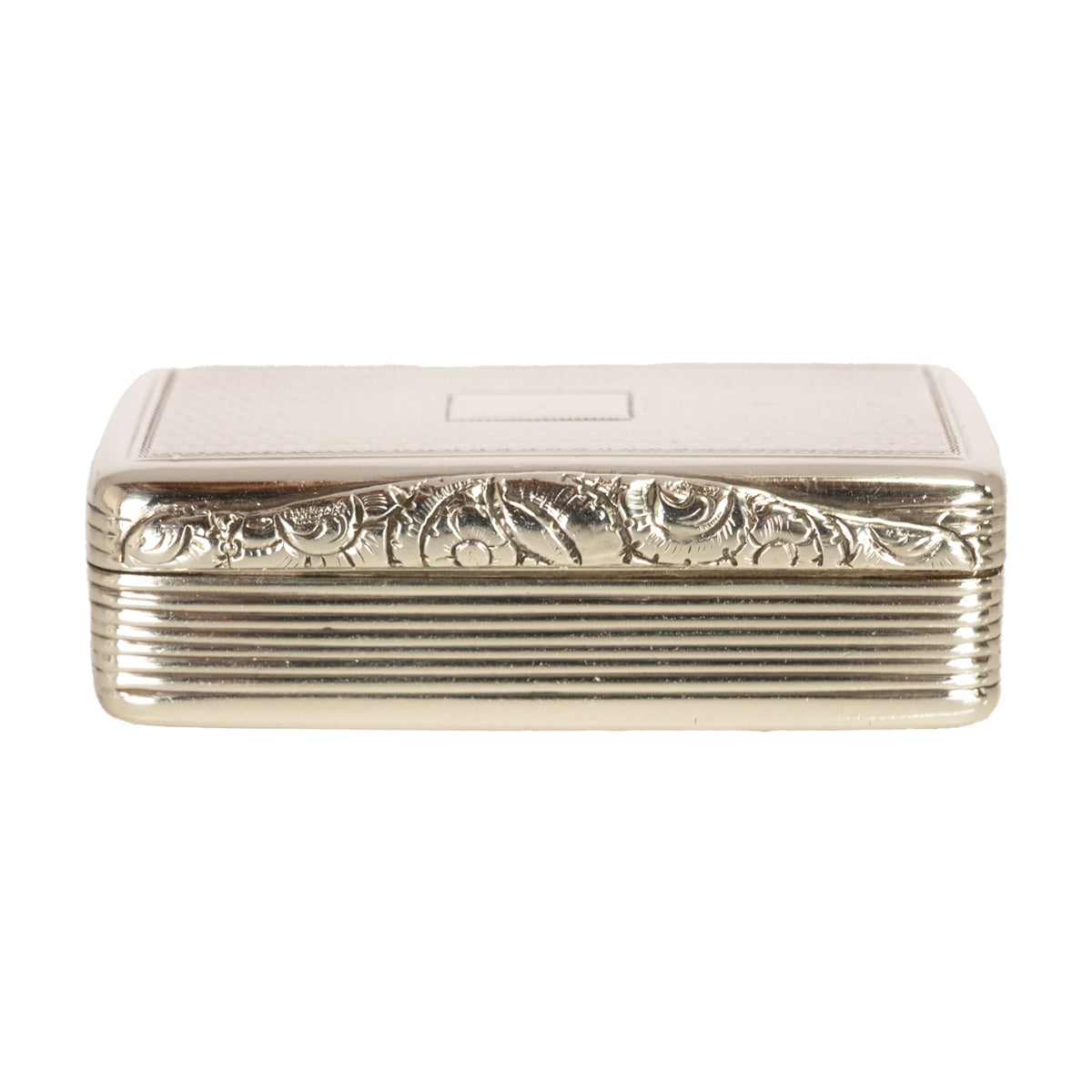 The hinged lid with engine turned decoration and a vacant rectangular cartouche to the center (no initials or monogram), the clasp is finely engraved with a floral design, the box closes tightly and opens with ease.