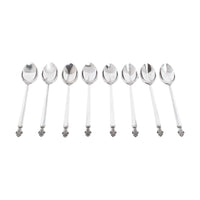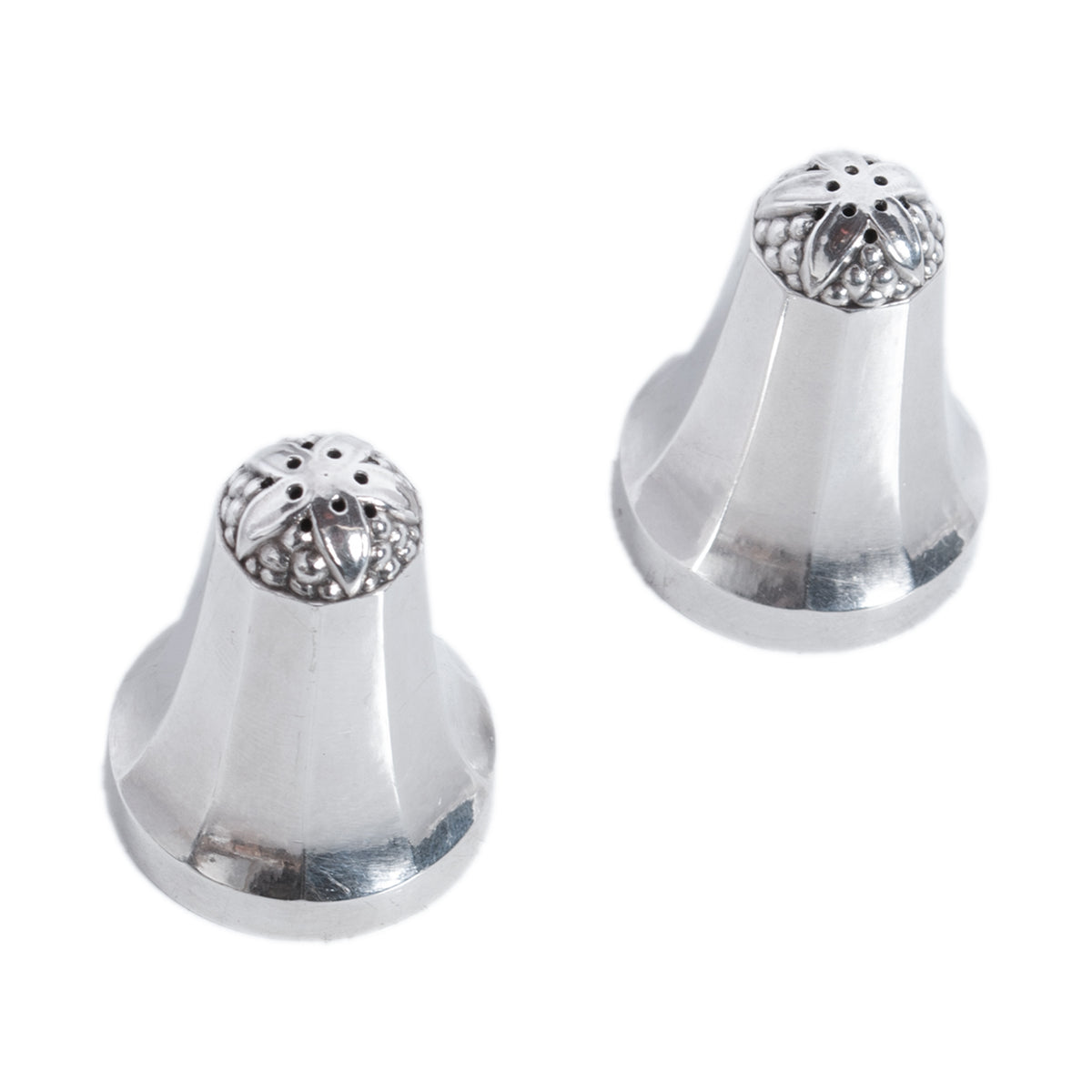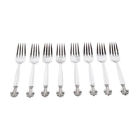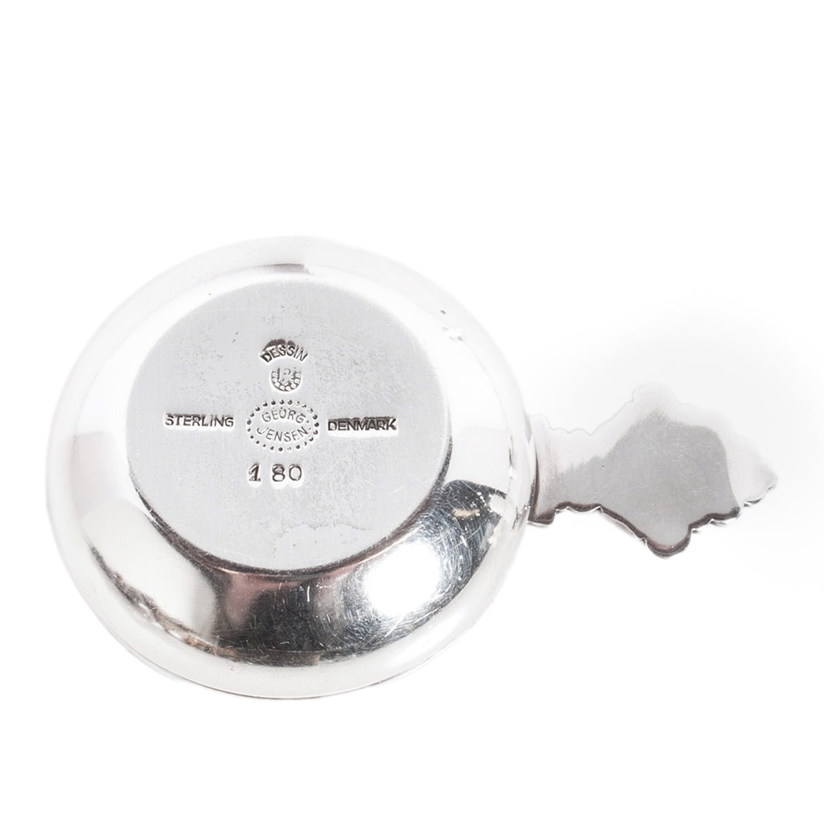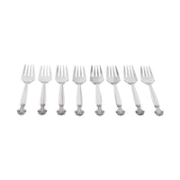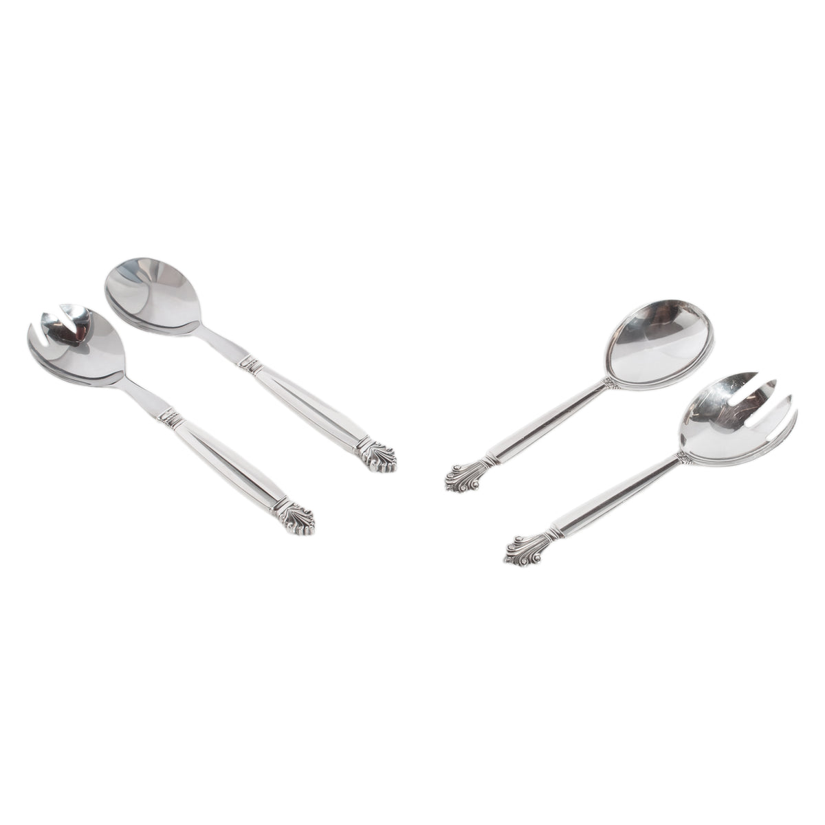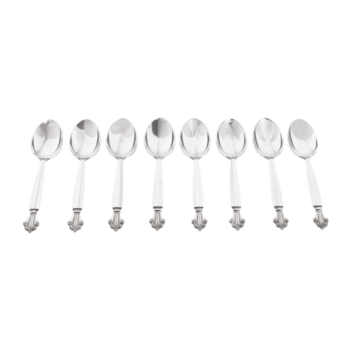 A very stylish 69 piece set of Georg Jensen Danish Mid Century Modern "Acanthus" pattern sterling silver dining flatware set for eight, circa 1950. Total sterling silver weight 2,212 grams.