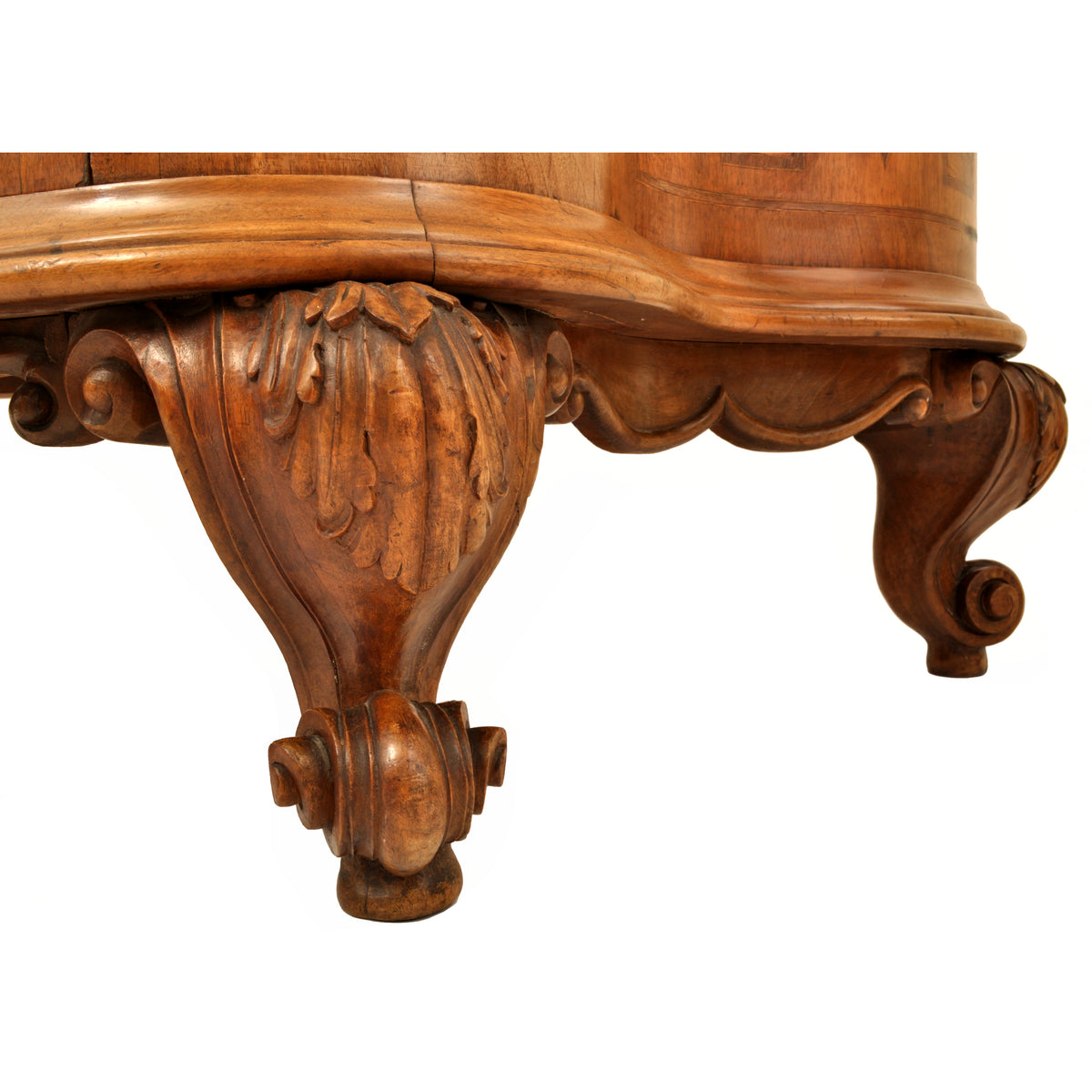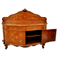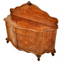 The sideboard of serpentine shape and having a carved and inlaid marquetry back, the back having a carved scrolled crest to the top and carved scrolls at each end, the serpentine top also having inlaid marquetry. The cabinet has the most impressive marquetry inlay throughout, made of fruitwood, walnut and burl ash, the front of the cabinet having twin drawers (original key is present) and twin cupboard doors below enclosing a single shelf. The cabinet having a carved & scrolled skirt, raised on squat cabriole legs with carved acanthus leaves and scrolled feet.