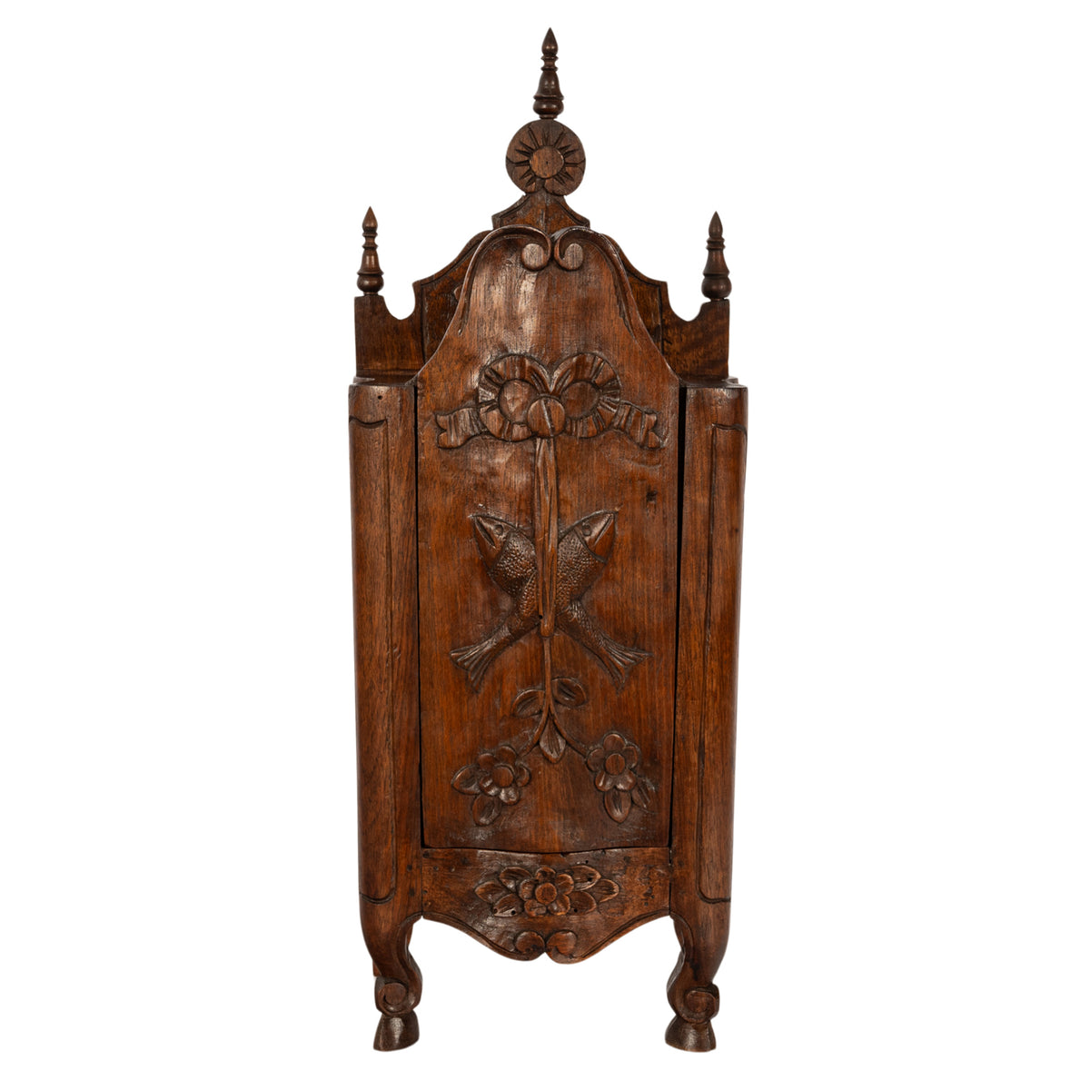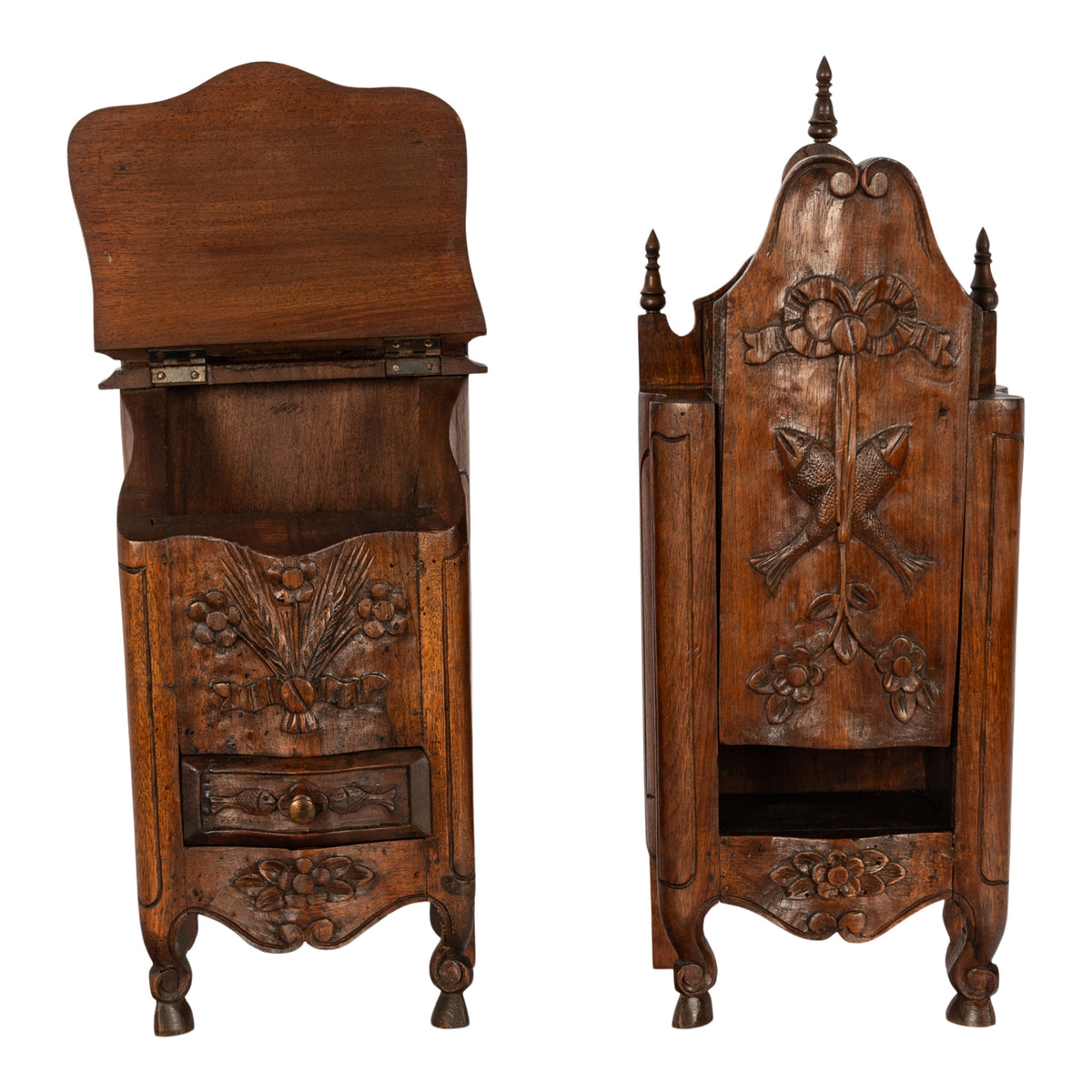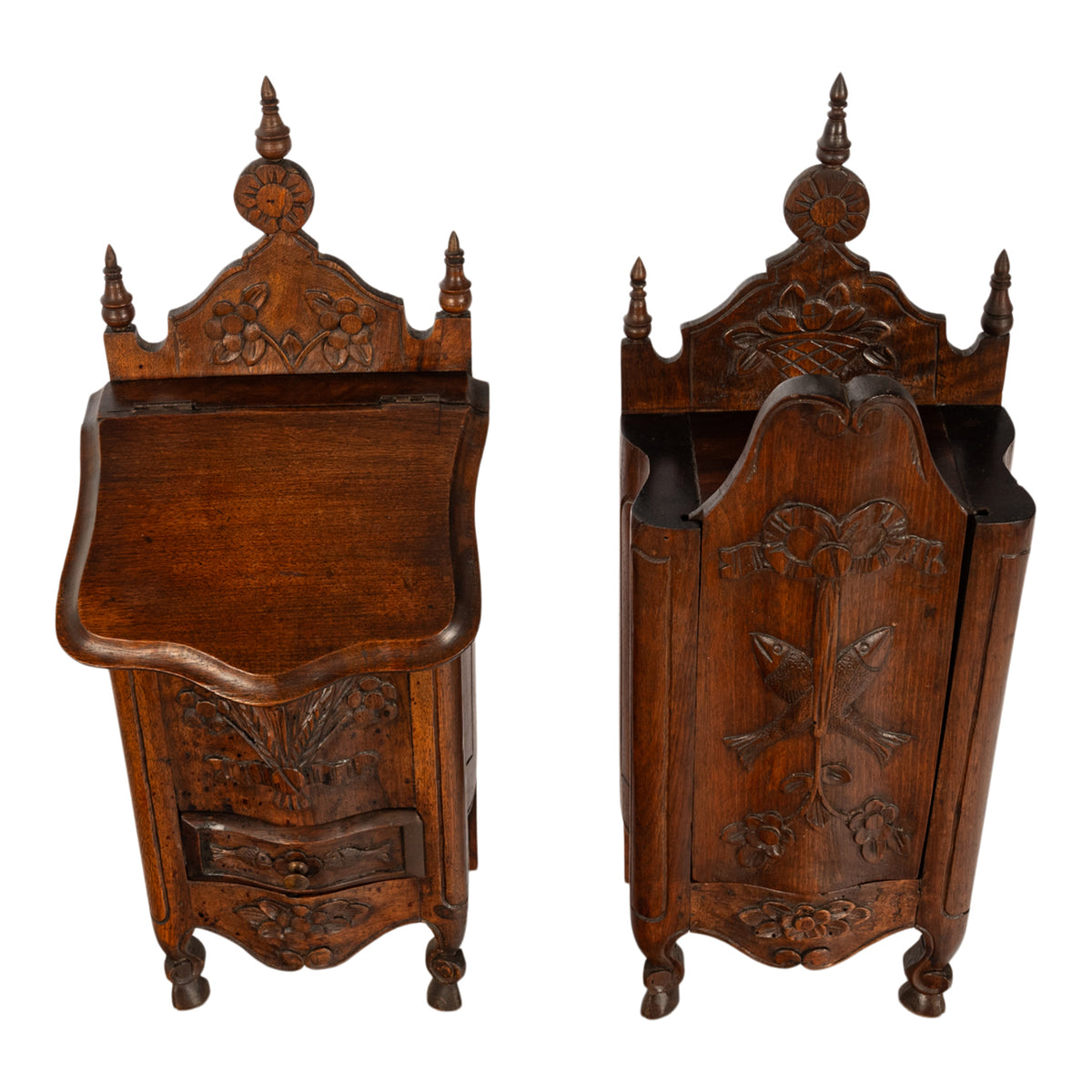 Each box is finely carved & both boxes have three turned finials to the back and each central finial having a carved 'sun' motif. The fariniere (used to store flour mainly for dusting fish) having a sliding door enclosing a storage area for flour. The door front carved with a pair of fish and a tied bow and other carved floral decoration with a carved flower basket to the top of the box.