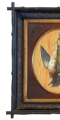 Trompe l'oeil is an artistic term for the highly realistic optical illusion of three-dimensional space and objects on a two-dimensional surface. Trompe-l'œil, which is most often associated with painting and it tricks the viewer into perceiving painted objects or spaces as real. This pair of paintings depict a pair of birds in each frame hanging from a pine panel, and due to the Trompe L'oeil style they have a three dimensional feel.